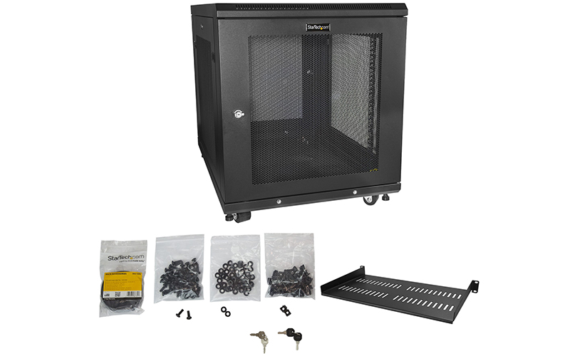 - The enclosed 12U cabinet comes pre-assembled with wheels/levelling feet for added stability