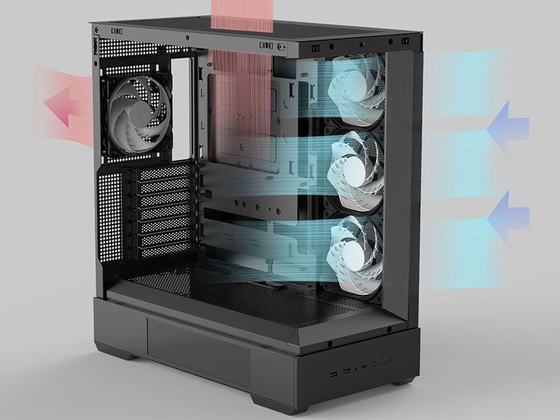 Front I/O ports include USB 3.0, USB-C and audio jacks, while ARGB lighting, managed by an integrated controller, offers up to 26 lighting effects. Finally, the ZM-AF120 fans supplied provide optimum airflow and are silent thanks to their hydro bearings and anti-vibration design.