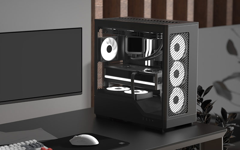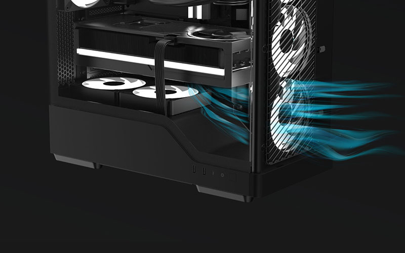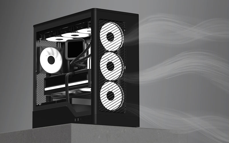 Designed around airflow, this case combines a ventilated metal mesh front panel with up to 12 fan slots. It comes with 4 x 120 mm ARGB PWM fans (3 at the front, 1 at the rear). You can supplement the ventilation with up to 3 x 120mm on the side, up to 3 x 120mm or 2 x 140mm on the top, and 2 x 120mm on the power supply cover. For liquid cooling, the top can accommodate a 120/140/240/280/360 mm radiator (optional). Removable nylon filters (front, top, bottom) simplify cleaning while limiting dust ingress.