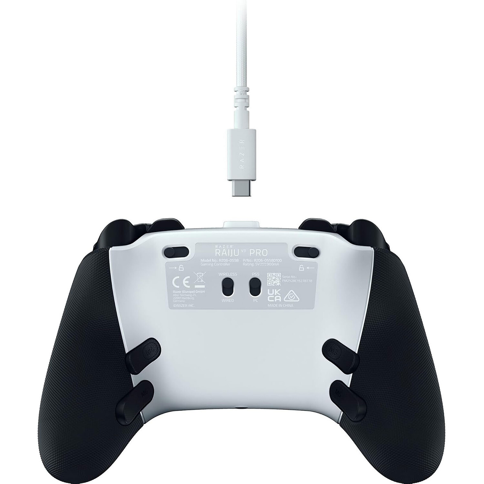 The Razer Raiju V3 Pro offers a 2.4 GHz Razer HyperSpeed wireless connection via USB dongle, as well as a wired USB-C mode. It features analogue sticks equipped with TMR technology, designed to limit drift, and mecha-tactile microswitch buttons for quick activation.