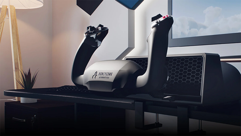 The Honeycomb Alpha Flight Controls has a left handle that includes two vertical two-position switches, an eight-position toggle switch and two buttons. On the right side, there are two horizontal two-way switches