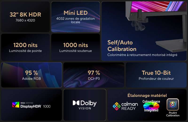 The ProArt Display PA32KCX features a 32-inch IPS panel with a density of 275 PPI and 8K UHD resolution for extremely fine rendering. Its Mini LED backlighting allows local dimming across 4,032 zones, ensuring deep blacks and a peak brightness of 1,200 nits (1,000 nits continuous). Colour coverage is exceptional: 99% Adobe RGB, 97% DCI-P3 and 100% sRGB, with Delta E < 1 for flawless colour accuracy. The monitor supports HDR10, HLG and Dolby Vision formats, as well as ASUS Smart HDR technology for an optimised viewing experience.