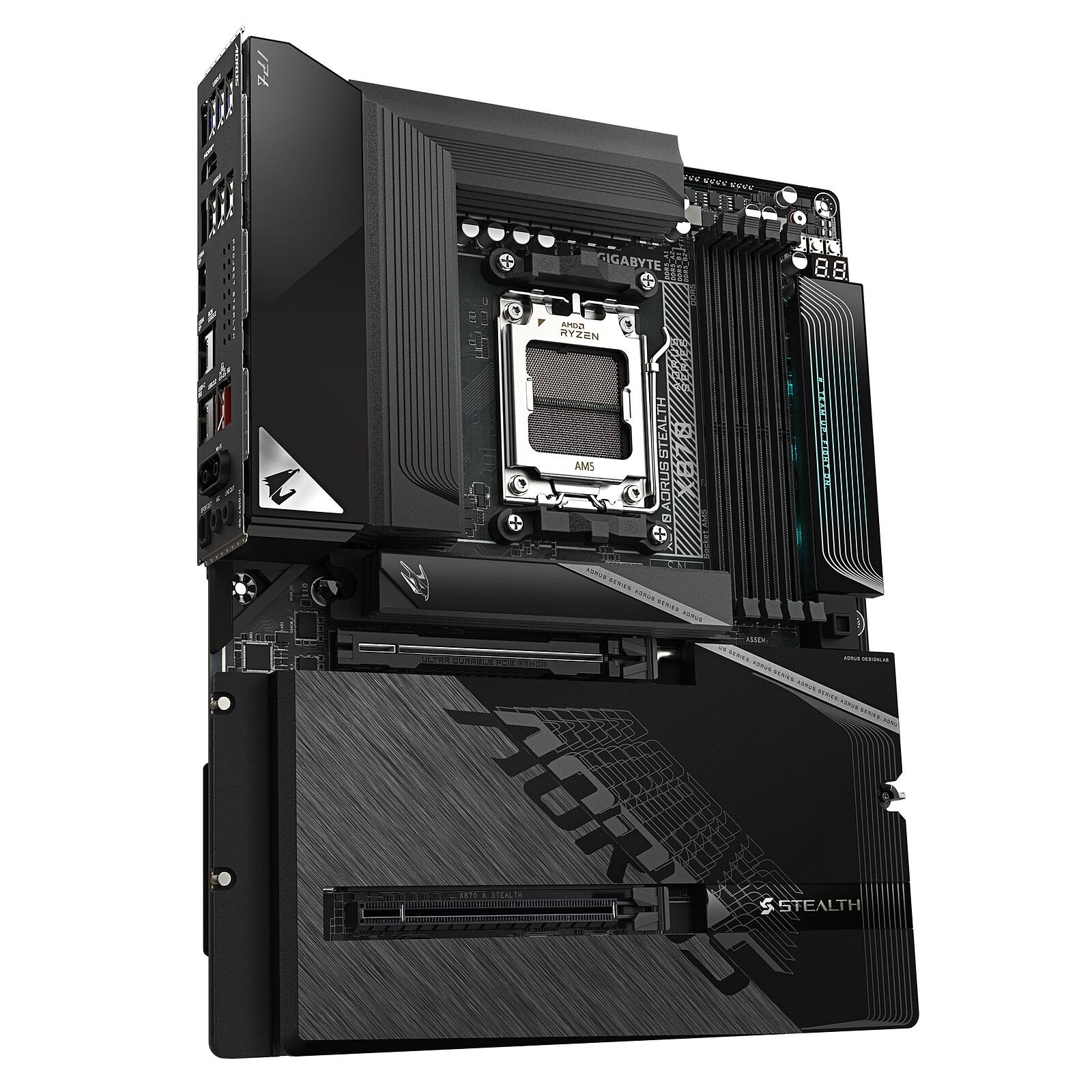The Gigabyte X870 AORUS STEALTH motherboard, with connectors located on the underside, features the AMD X870 chipset, making it ideal for laying the foundations for a high-performance gaming setup. Its AMD AM5 socket allows it to support AMD Ryzen 7000/8000/9000 processors. It has 4 DDR5 slots and can utilise PCI Express 5.0 graphics cards and M.2 NVMe SSDs for breathtaking performance. It offers comprehensive connectivity with 2.5 GbE LAN, Wi-Fi 7 and Bluetooth 5.4, as well as USB 3.2 and 4.0.