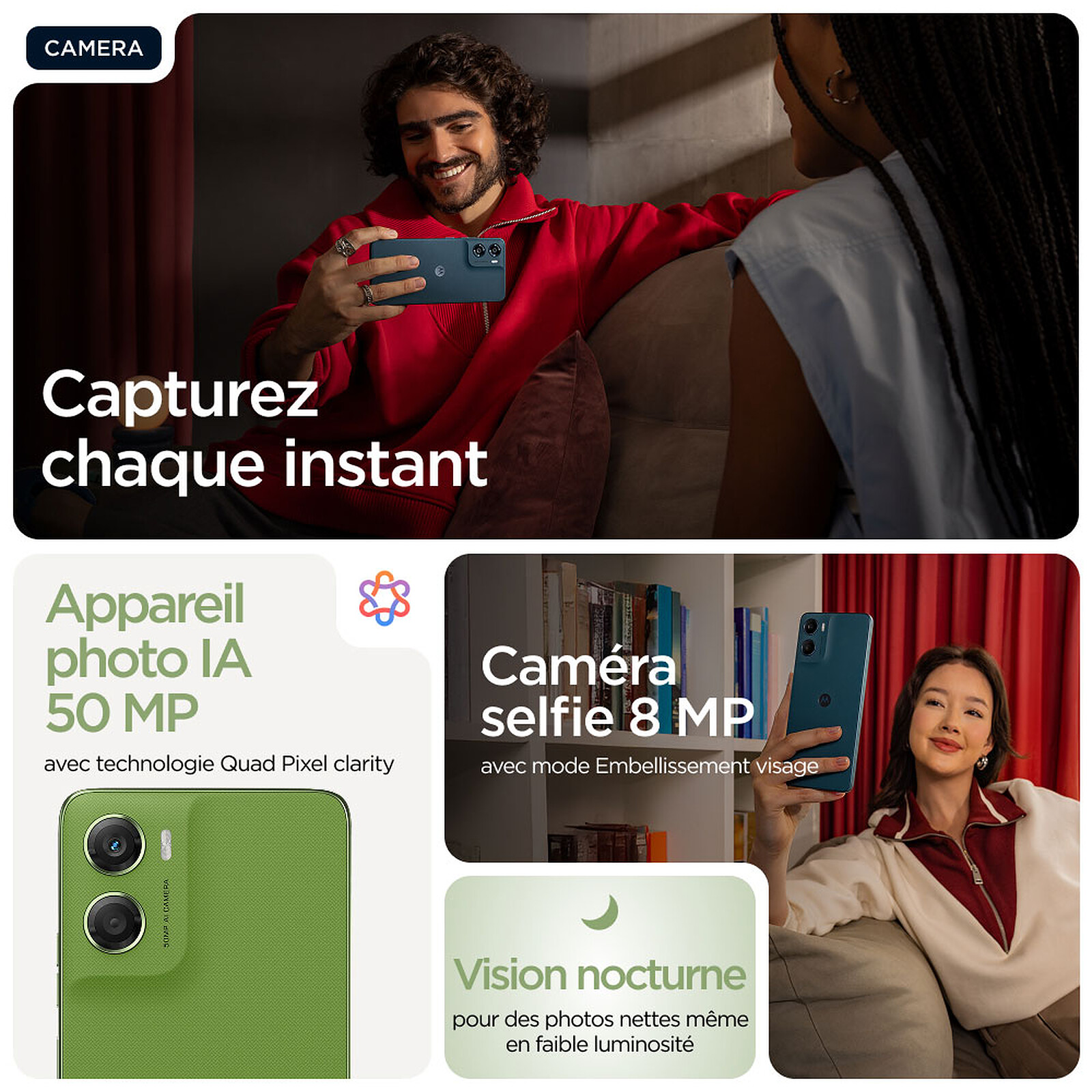 The moto g06 includes a primary 50 MP camera with f/1.8 aperture and Quad Pixel technology, along with PDAF autofocus. This sensor lets you capture detailed photos in different shooting conditions. Several modes are available, including Night Vision, Portrait, Panorama, live filters, and Google Lens integration.