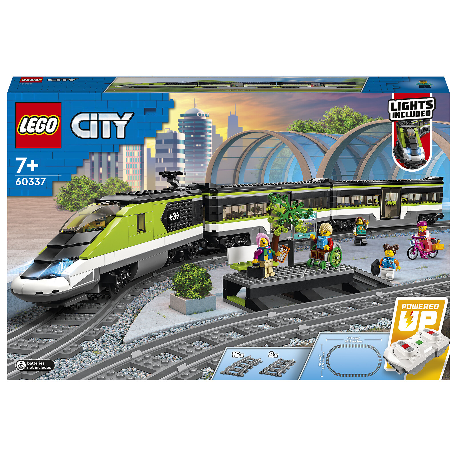 The LEGO City Express Passenger Train (60337) includes a remote-controlled high-speed locomotive featuring LEGO Powered Up technology, with functional dimmable headlights, a dining car, a passenger car, a station platform, 24 tracks and 6 minifigures, for hours of train-themed play. For kids and train fans.This set includes an easy-to-follow building guide for each model. Kids aged 7 and up can choose to build on their own, with family or with friends for an exciting build-and-play experience. Fun toys and much more.
