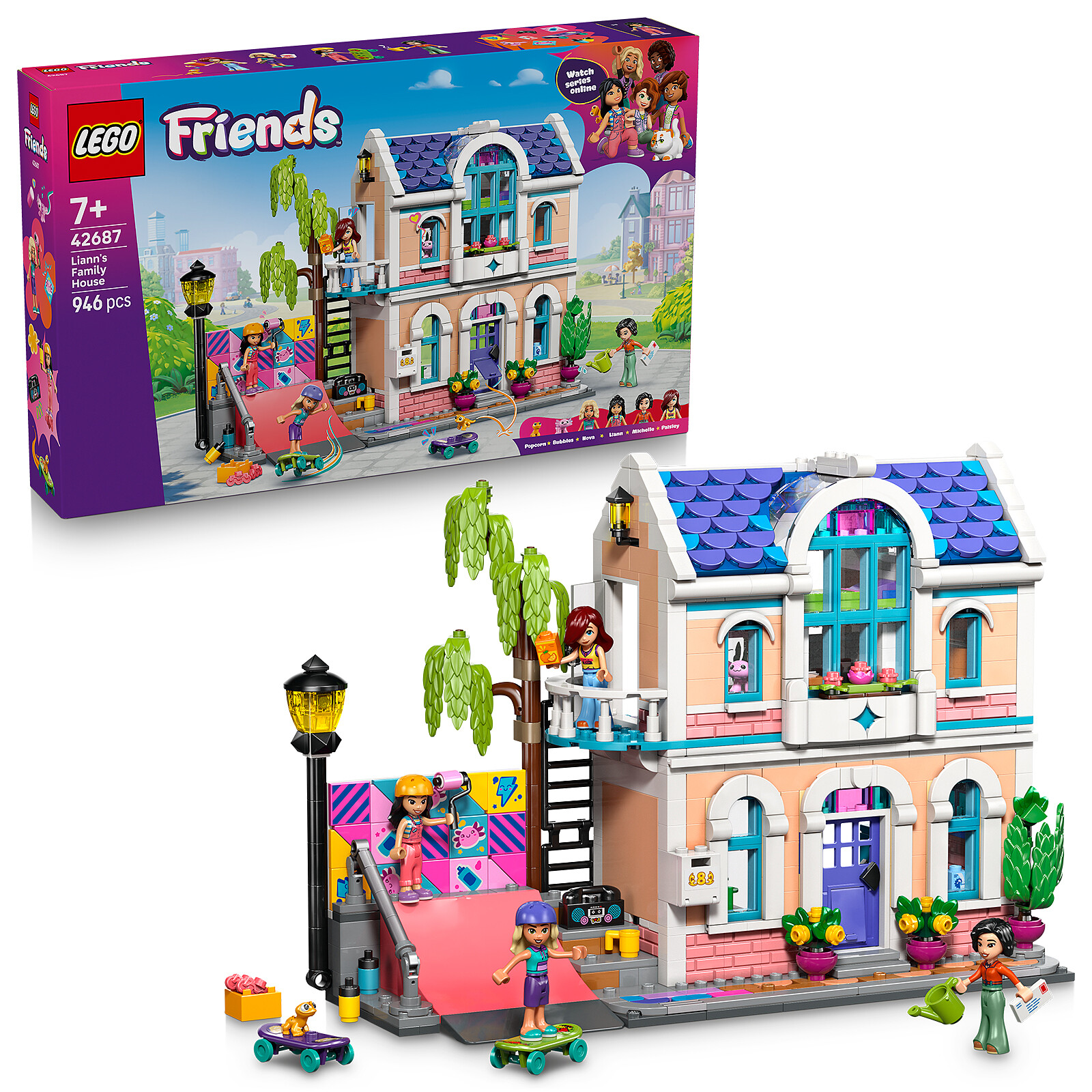 Welcome to Liann's Family House (42687), which inspires creative stories for children aged 7 and up. Girls and boys can explore this LEGO house with kitchen, living room, bedroom, balcony and garden. Try out different activities: Liann and her friends love skateboarding, creating artworks and taking care of the gecko and the axolotl.This building set includes 4 mini-dolls and lots of accessories: skateboards, art supplies, hi-fi system, desk, terrariums and more. The set also includes utensils and ingredients: baguettes, noodles, soy sauce, milk and orange juice. Kids can use their decorating skills by arranging the removable tiles to customise the mural.