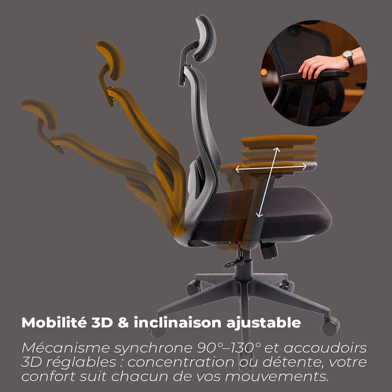 Esta silla de oficina cuenta con un asiento de espuma moldeada de alta densidad 70D, un mecanismo síncrono que bascula de 90° a 130° y una malla transpirable, que garantizan un confort duradero y una ergonomía óptima. Los reposabrazos 3D, la base robusta y las ruedas silenciosas de PU ofrecen precisión, estabilidad y una movilidad suave.