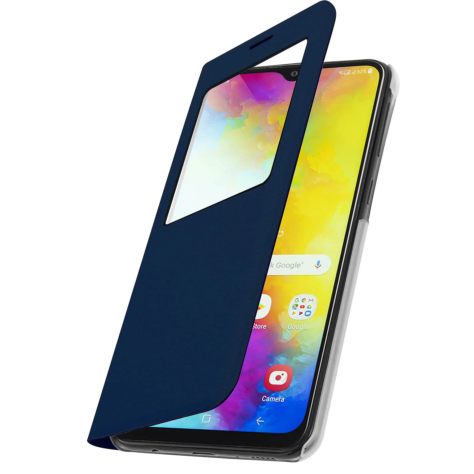 Étui Flip book cover à fenêtre spécialement conçu pour Samsung Galaxy M20 Fenêtre d'affichage transparente pour garder en vue les notifications et l'heure Coque de maintien sur-mesure en polycarbonate rigide et résistant Caméra dégagée et connectiques totalement accessibles