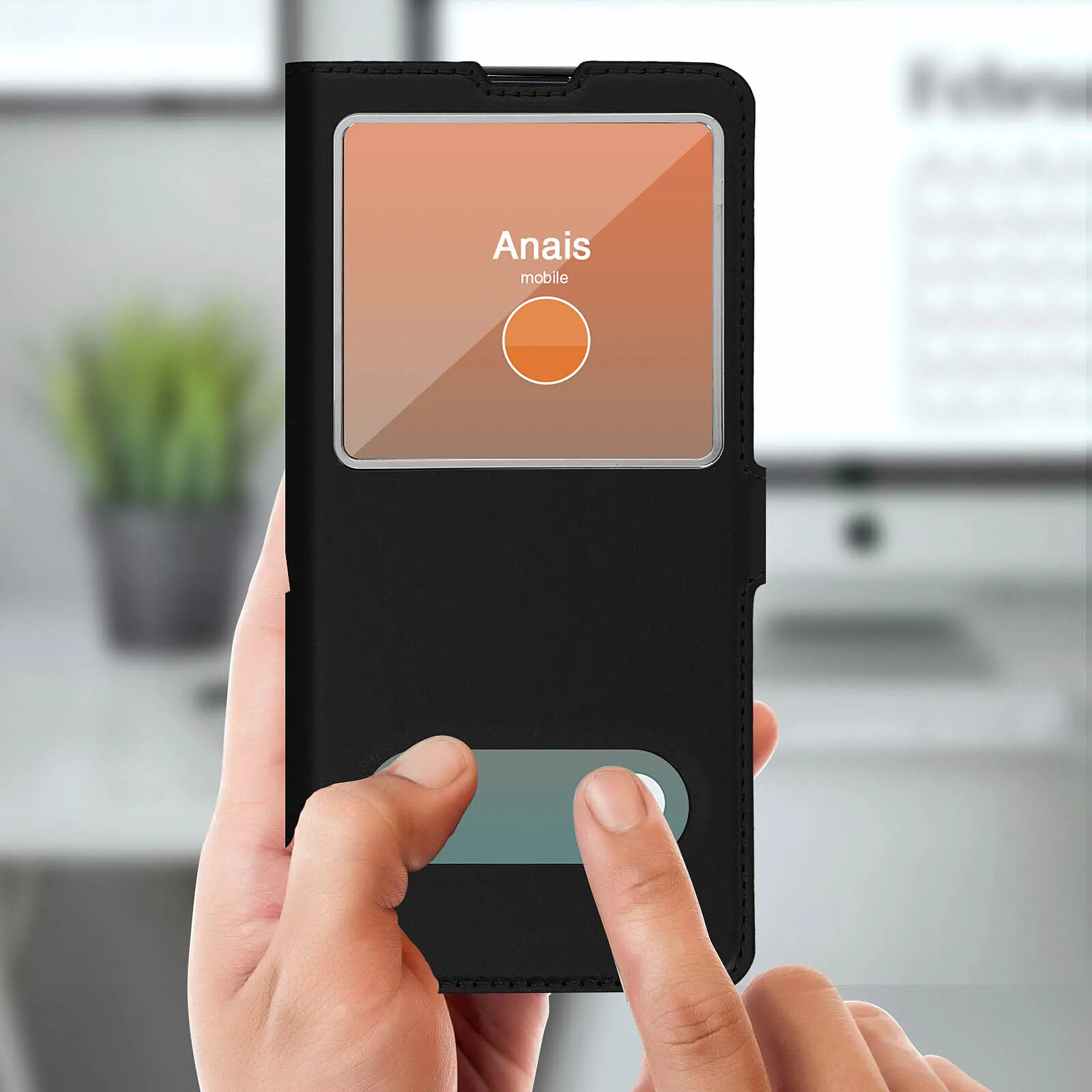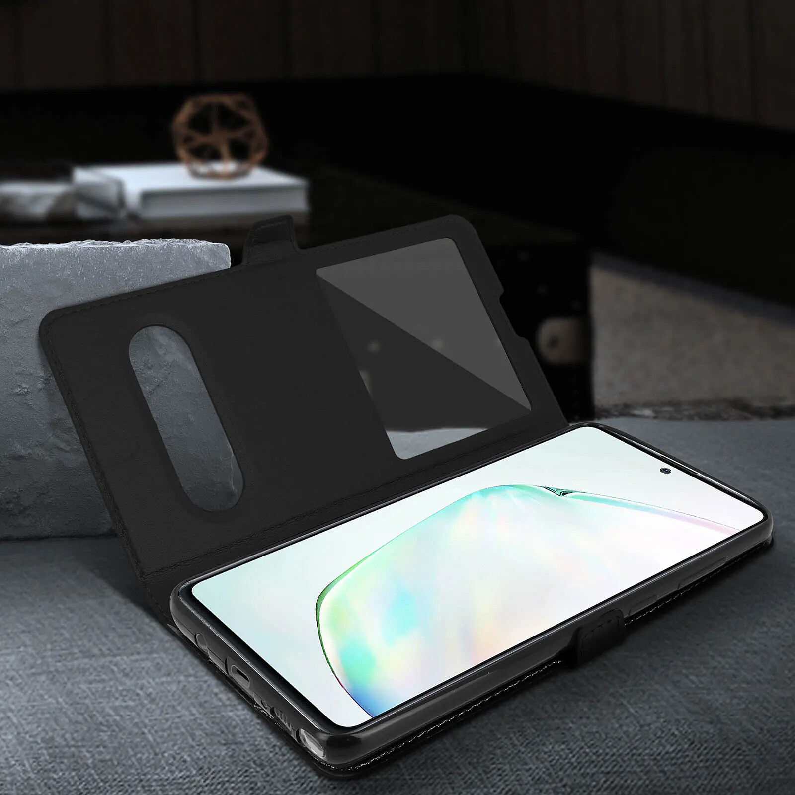 Étui folio 2x fenêtres + fonction support Samsung Galaxy Note 10 Lite. Protection intégrale contre les chocs et rayures. Fenêtre d'affichage et ouverture pour décrochage rapide. Fonction support pour photos et vidéos. Coque de maintien en silicone.