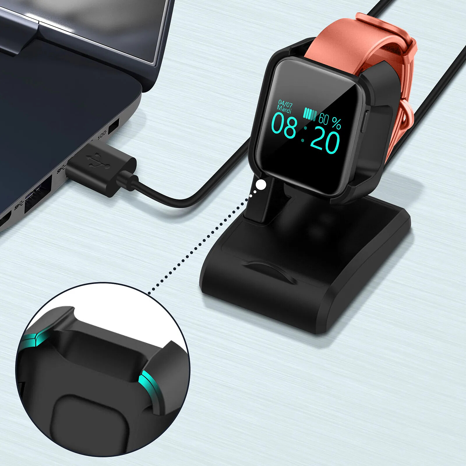 Dock de charge pour mi Redmi Watch et Mi Watch Lite. Surélévation sécurisée de votre montre pur accéder facilement à son écran. Rattaché à un câble USB de 90cm. Ultra-stable avec 4 crochets de maintien et 4 patins antidérapants.