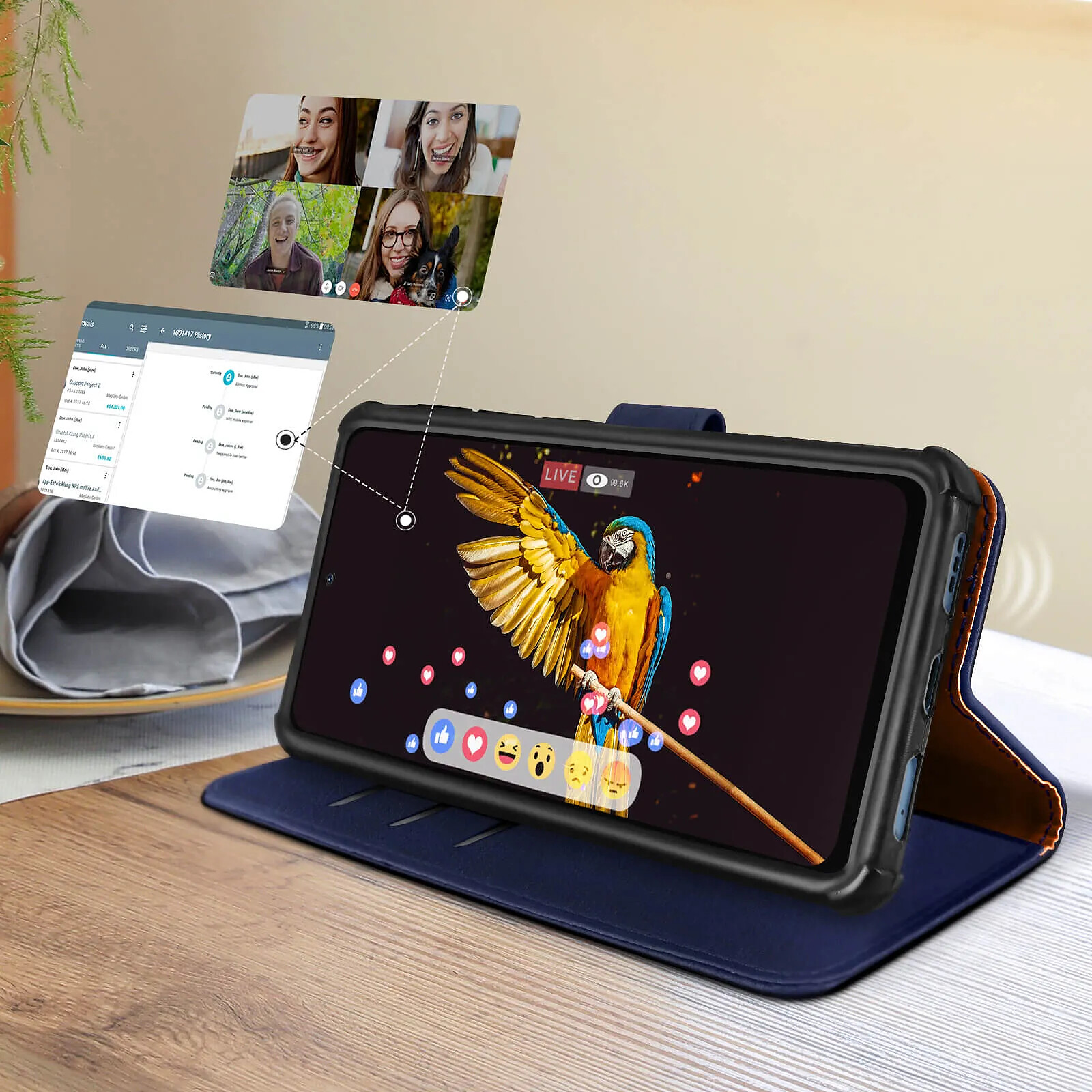 Housse universelle pour smartphone 5,5 à 6 pouces. Trois compartiments cartes et pochette pour billet de banque. Languette magnétique intégrée. Coque de maintien flexible avec coins renforcés. Découpes universelles pour laisser les fonctions accessibles.