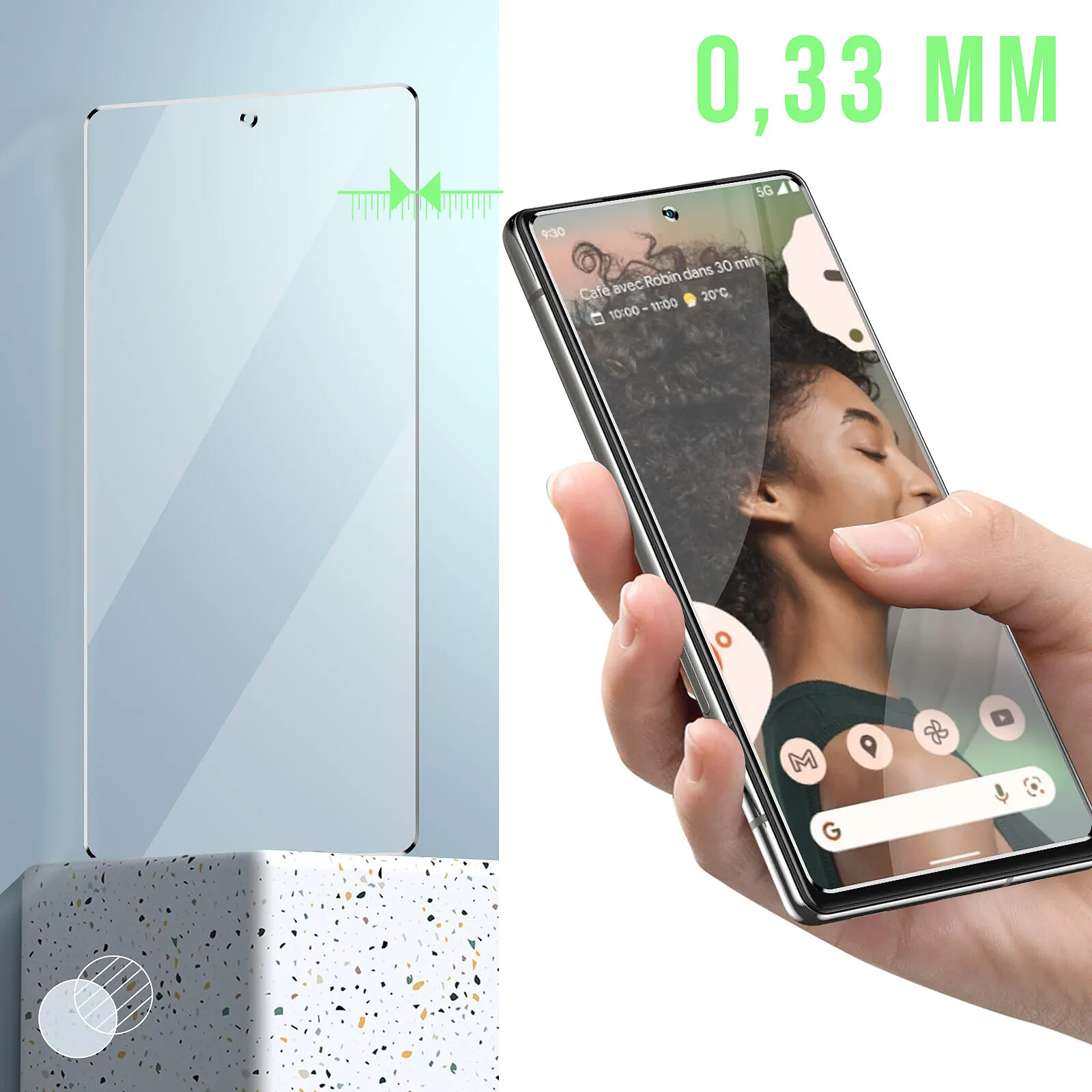 Film de protection écran en verre trempé pour Google Pixel 6a. Dureté 9H résistant aux chocs et rayures. Ultra-fin et transparent : fluidité tactile et rendu d'affichage conservés. Revêtement oléophobique. Kit de nettoyage inclus.