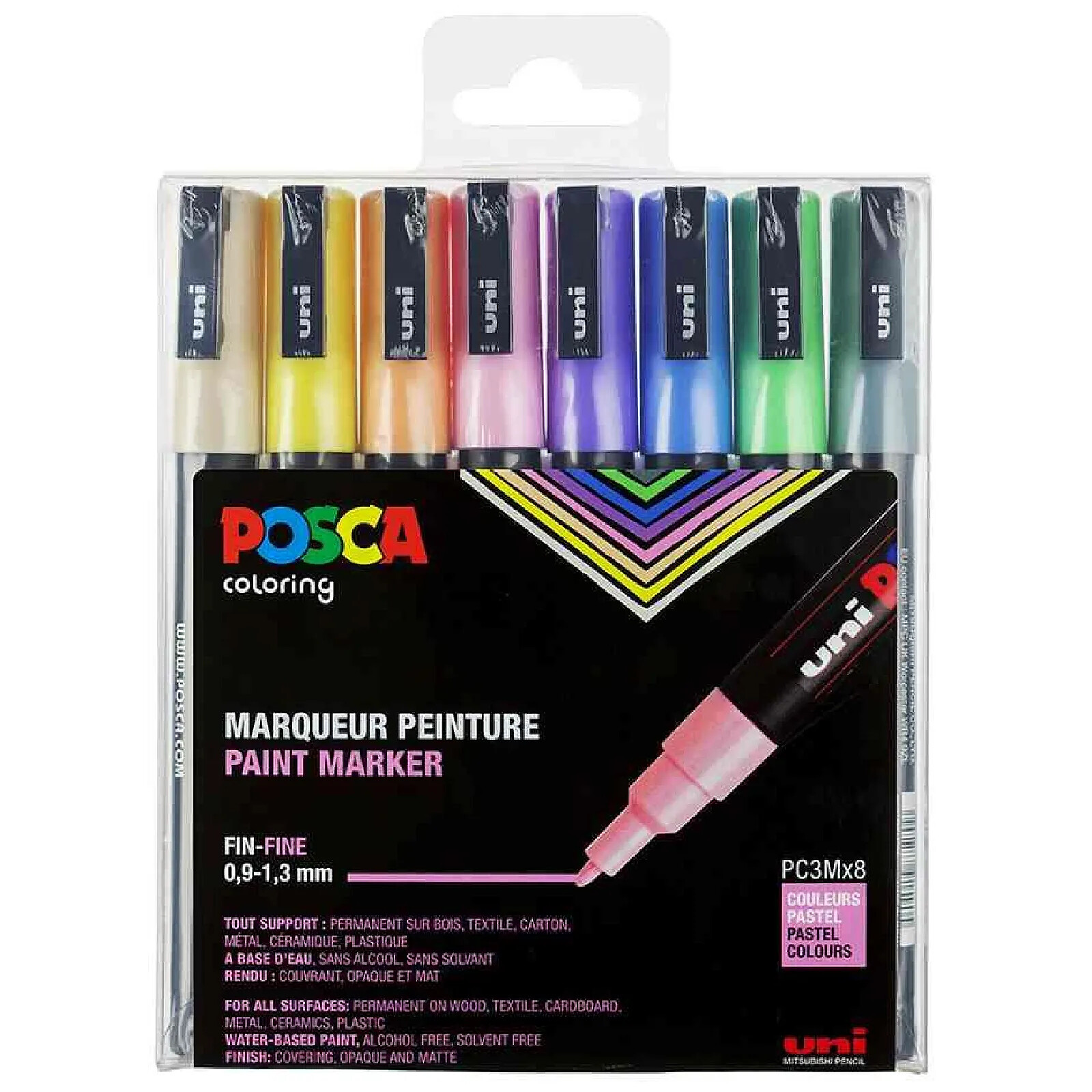 POSCA Lot de 8 marqueurs PC3M pointe conique fine couleurs pastel assorties