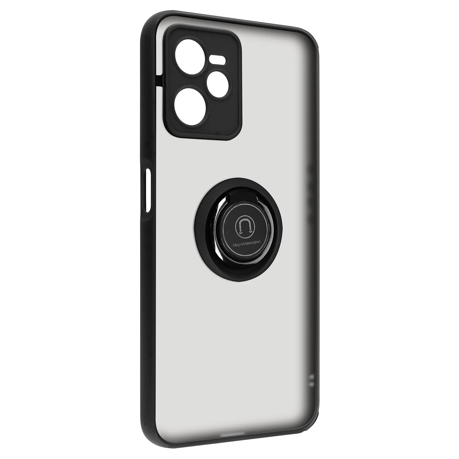 Coque pour Realme C35. Conçue en polycarbonate + silicone gel. Bague de maintien pouvant se transformer en support vidéo. Finition métallique compatible avec un support magnétique. Dos mat anti-traces. Fonctionnalités accessibles.