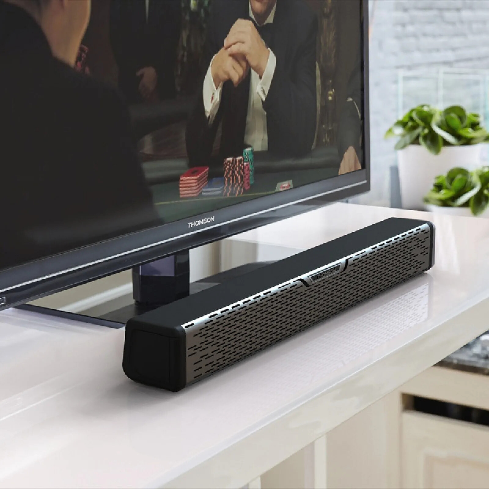 Un design singulier et racé, une belle puissance musicale sonore, une pluralité d'utilisation. Un renouvellement de style pour la marque Thomson tout en conservant ces nombreuses fonctions qui font le succès des barres de son. La SB60BTS prend peu d'espace, elle est idéale pour les petits logements comme pour une chambre. Elle peut être posée ou accrochée au mur. Que ce soit pour sonoriser un film, ambiancer une soirée, ou pour une partie de jeu vidéo frénétique, la SB60BTS est LA barre de son.