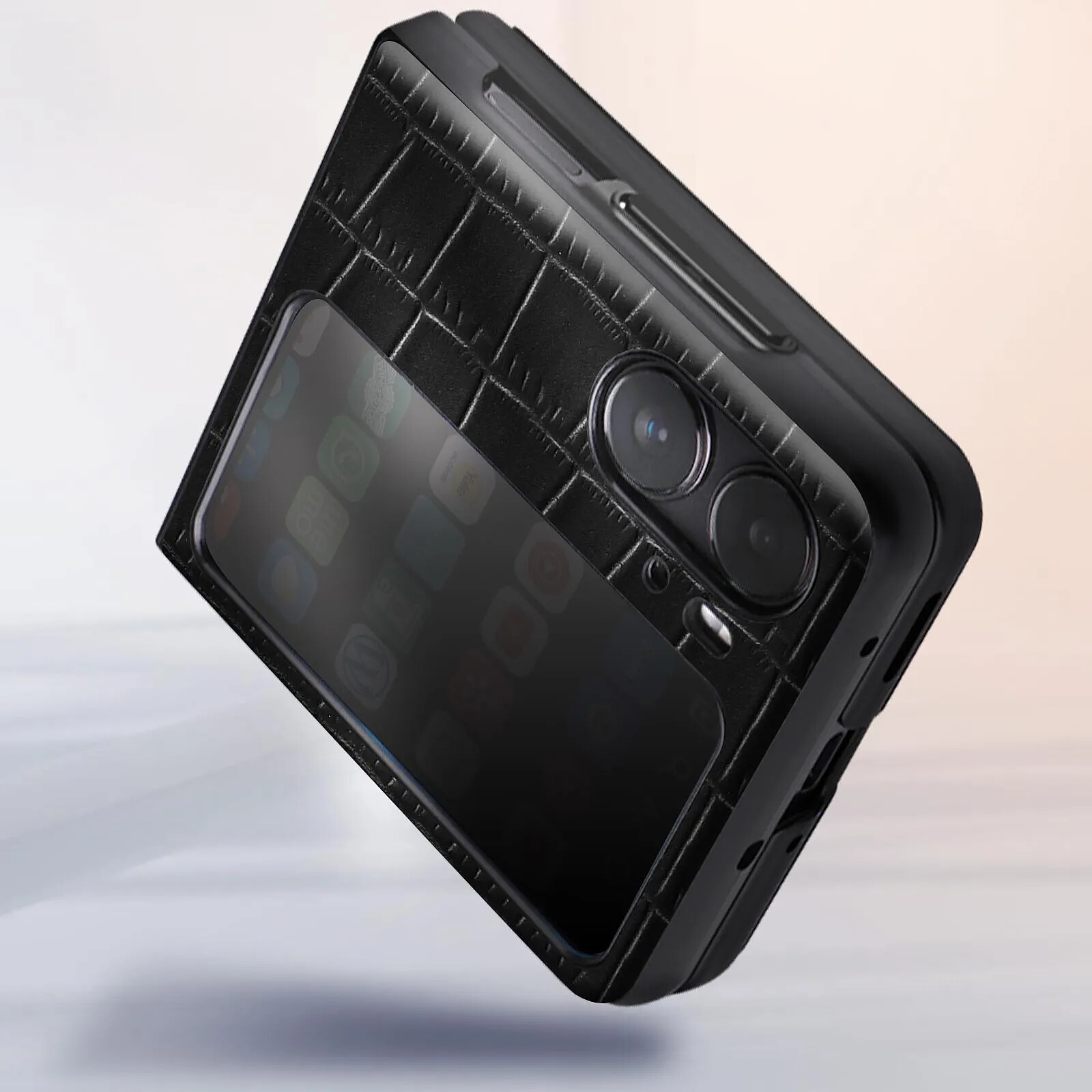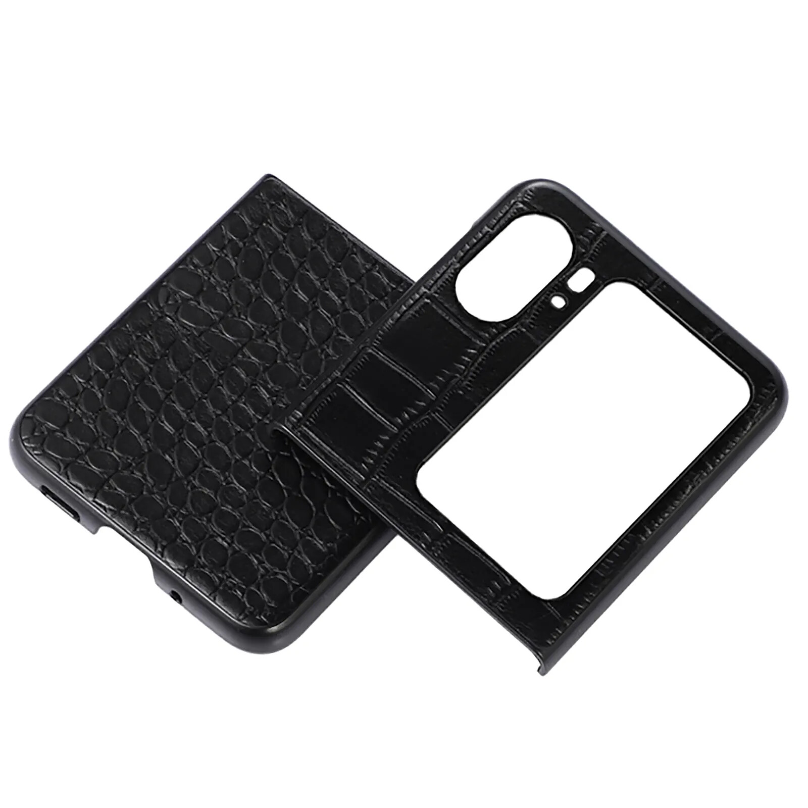 Coque Cuir pour Oppo Find N2 Flip. Design à texture crocodile. Conception en deux pièces. Bords surélevés pour une protection contre les rayures. Fabriquée en cuir durable. Découpes précises pour un accès aux fonctionnalités. Deux écrans fonctionnels.
