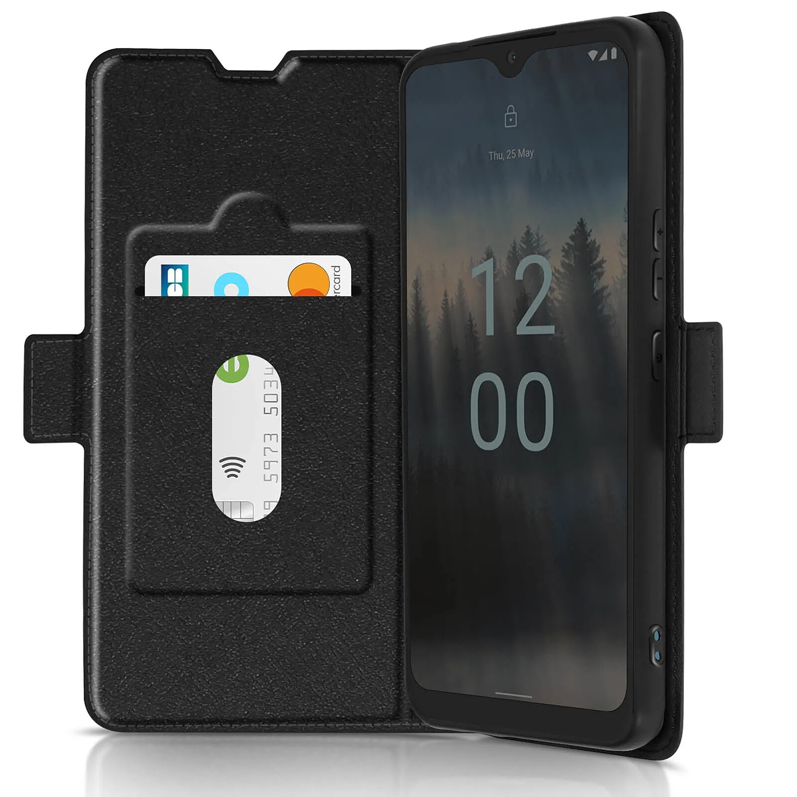 Étui pour Nokia C12, série Wallet Slim. Protection intégrale contre les chocs et rayures. Mini double languette magnétique. Caméra rehausée. Porte-carte intégré. Fonction support vidéo. Design slim. Coque de maintien en silicone gel.