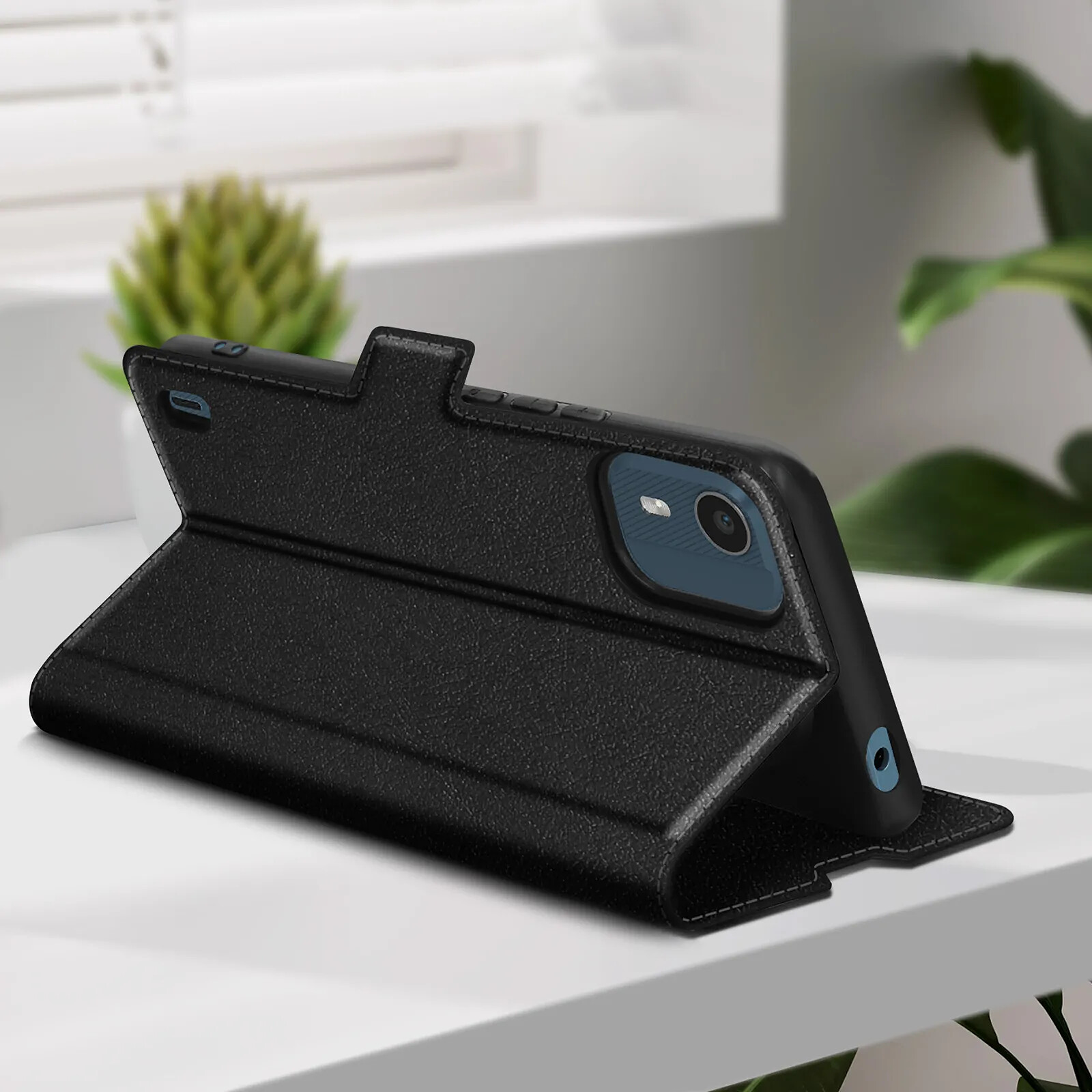 Housse de protection noir de la série Wallet Slim, spécialement conçue pour le Nokia C12 Protection fiable contre les chocs et rayures tout en préservant la finesse du mobile Espace de rangement pour carte intégré dans la doublure du clapet Fonction support horizontal pour regarder vos vidéos confortablement