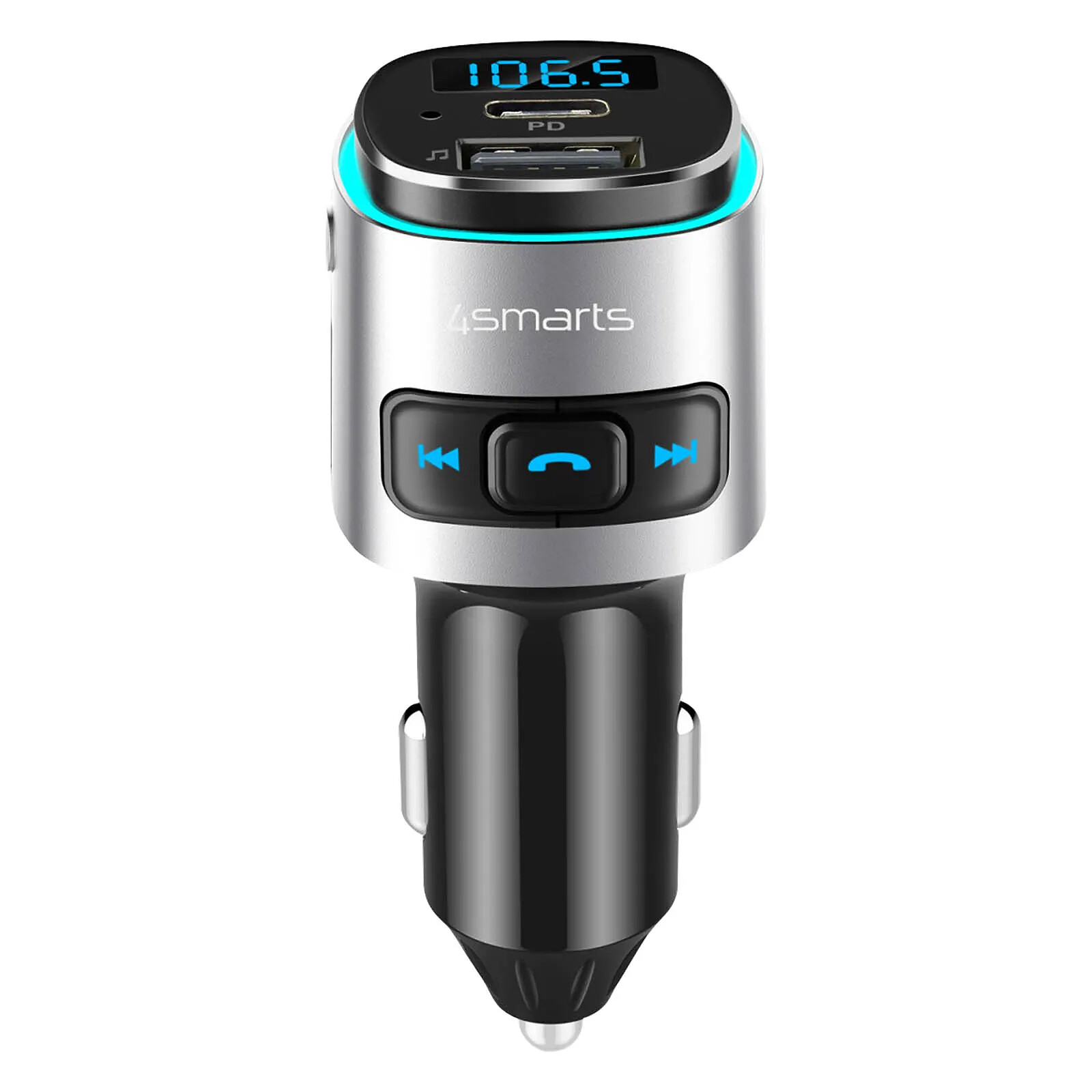 4smarts présente votre Transmetteur FM Bluetooth, qui présente un chargeur voiture à double ports USB + USB-C