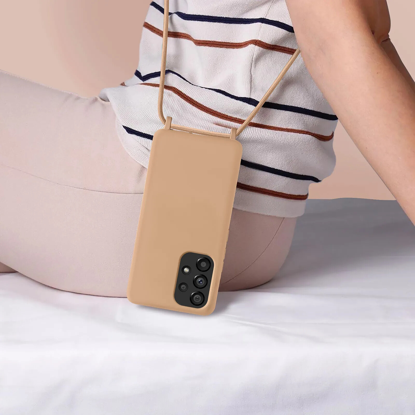 Coque avec corde Samsung Galaxy A53 5G. Cordon nylon tressé ajustable de 80cm de long, fonction tour du cou ou bandoulière. Coque semi-rigide en polycarbonate + silicone gel. Bords écran et caméra rehaussés. Fonctions accessibles, boutons redessinés.