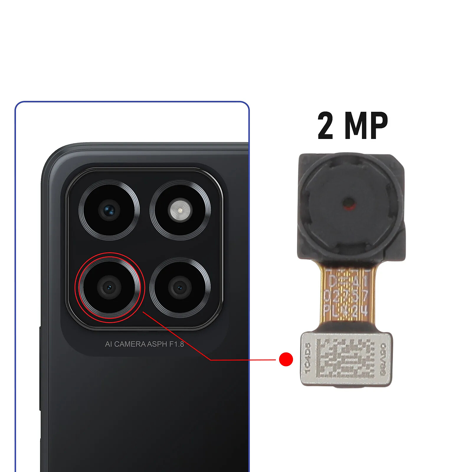 Caméra arrière Objectif Macro de remplacement 2MP pour Honor X8 5G. Remplacez le capteur Macro défectueux de votre téléphone et capturez des détails fins de petits sujets. Compatible à 100%, nappe de connexion intégrée, prêt à être installée.