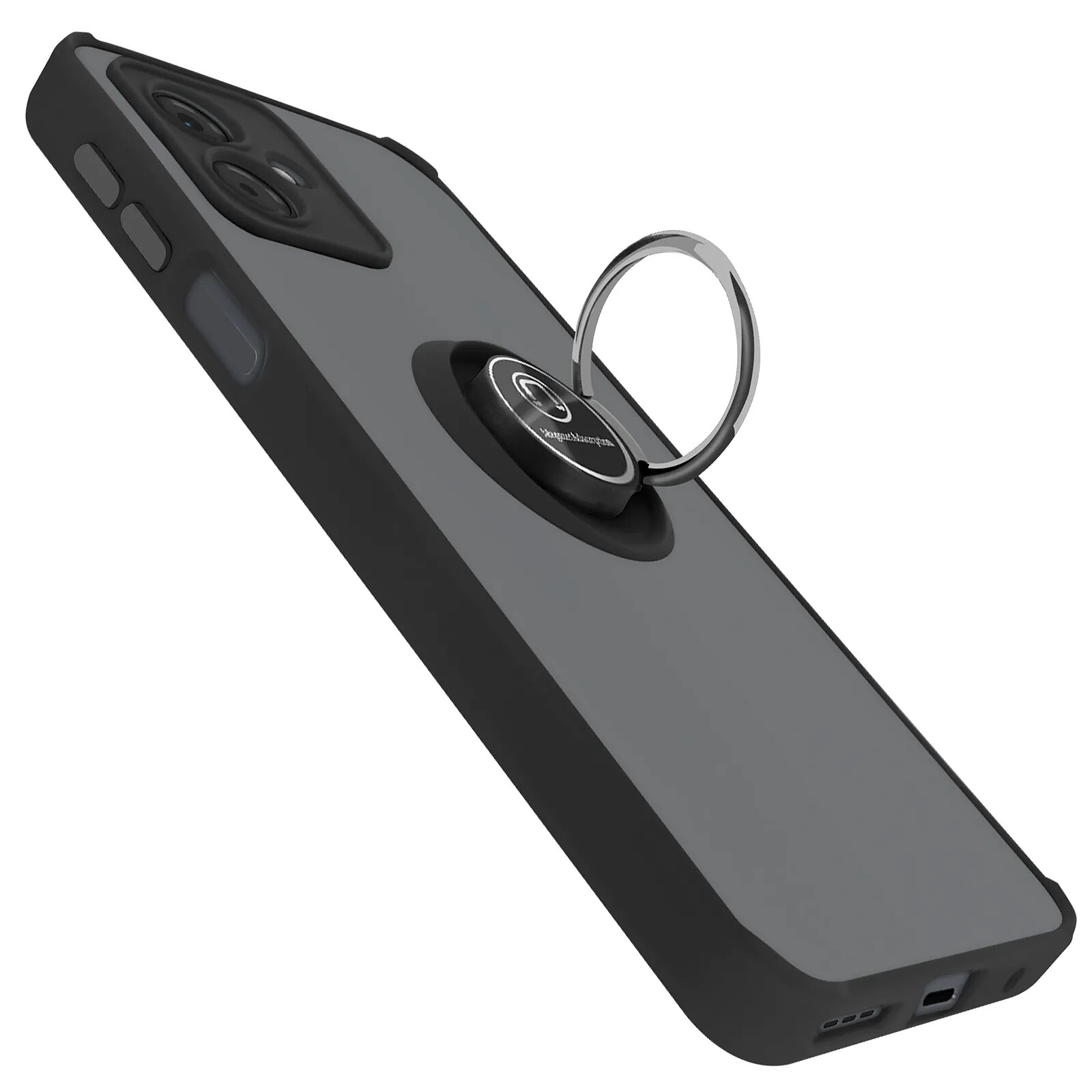 Coque Antichoc pour Motorola Moto G14. Conçue en polycarbonate + silicone gel. Bague de maintien pouvant se transformer en support. Finition métallique compatible avec un support magnétique. Dos transparent givré anti-traces. Fonctionnalités accessibles.