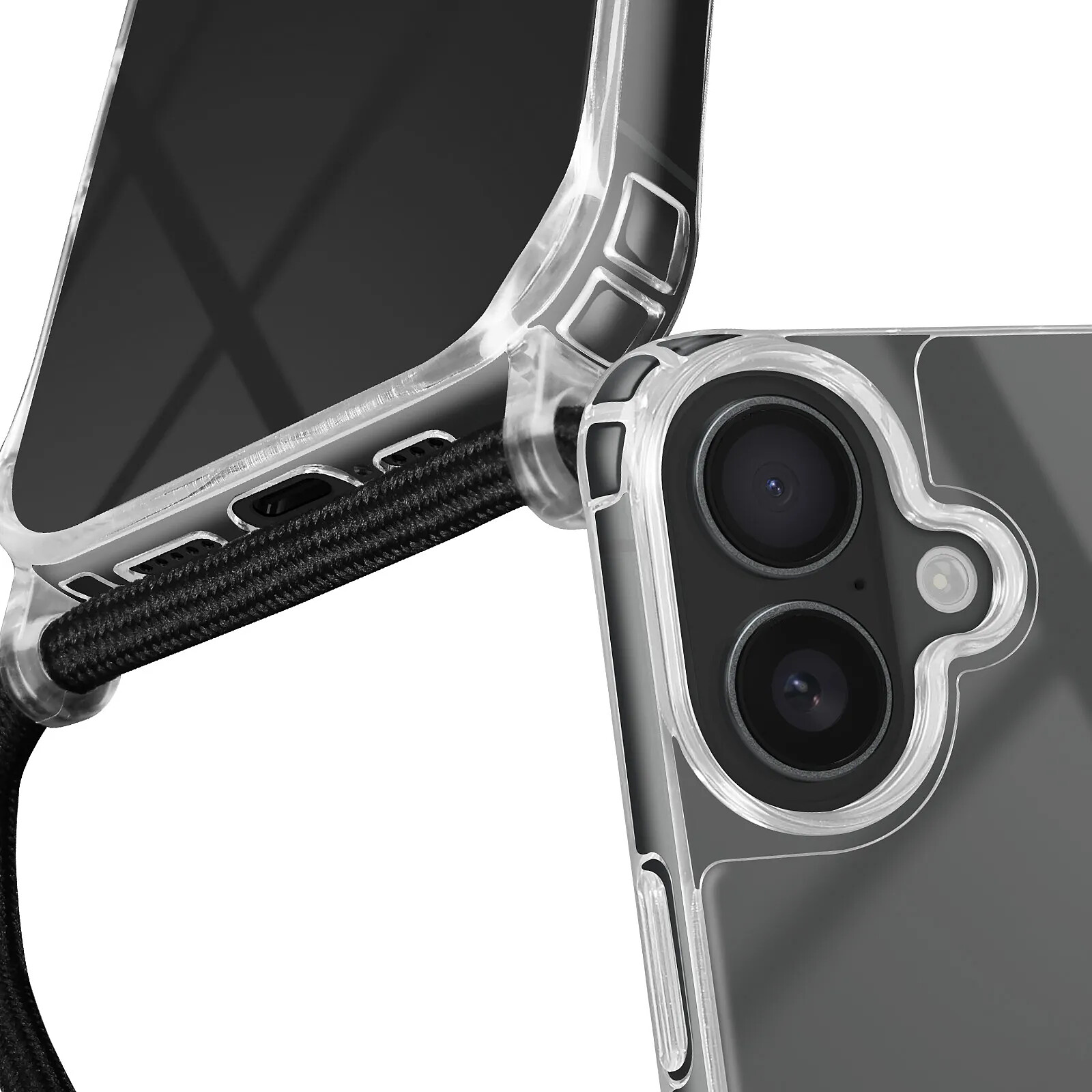 Coque Antichoc pour iPhone 16 Plus. Cordon amovible en nylon tressé d'une longueur de 70cm. Conception en silicone souple avec coins renforcés antichocs. Finition transparente laissant visible la couleur du téléphone. Fonctions accessibles.