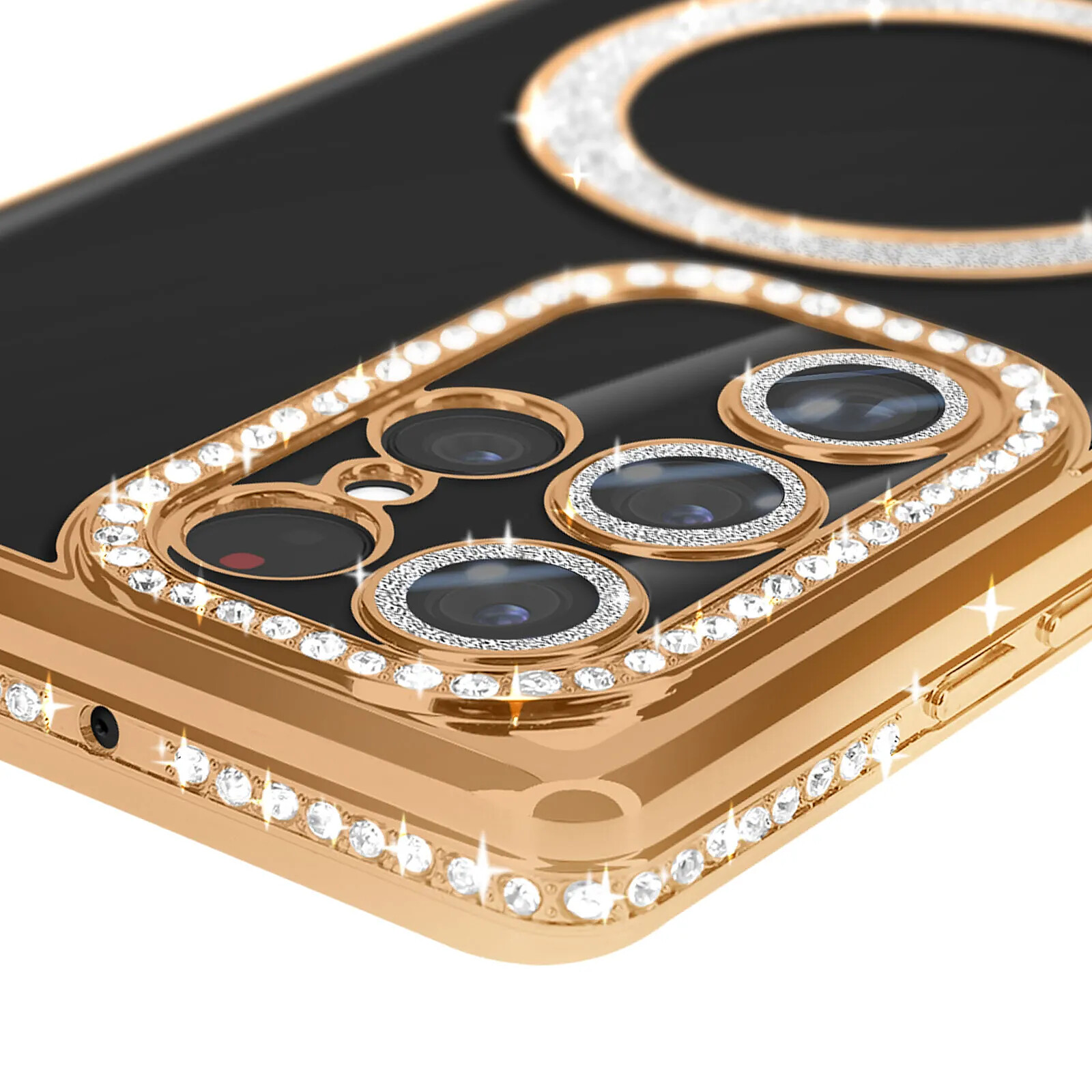 Coque diamant pour Samsung Galaxy S23 Ultra au contour strass très élégante et unique. Conception résistante avec bloc caméra protégé. Dos transparent. Cercle magnétique compatible accessoires MagSafe. Fonctions accessibles. Boutons latéraux redessinés.