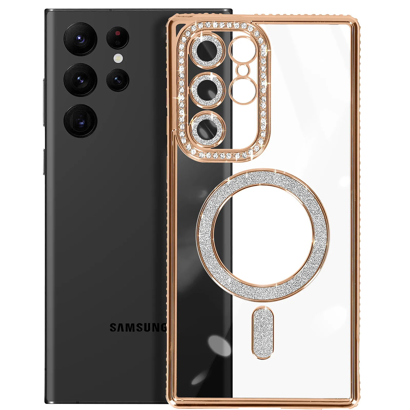 Avizar Coque Diamant pour Samsung Galaxy S23 Ultra MagSafe Contour Strass Dorée |