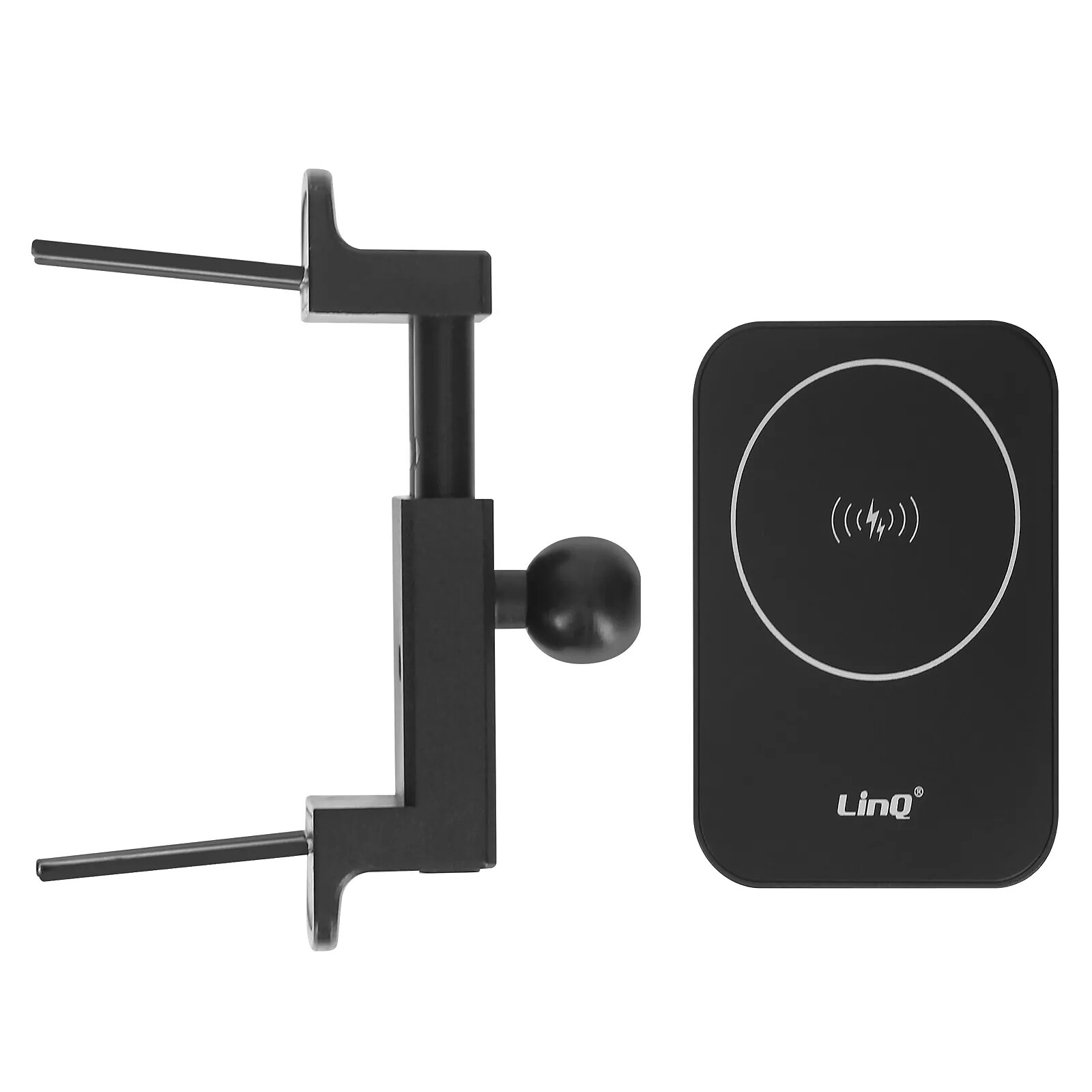 Support Voiture MagSafe LinQ. Charge MagSafe pour iPhone avec aimants puissants. Charge adaptable de 5W à 15W. Fixation grille d'aération ronde. Rotation à 360°. Adaptateur MagSafe inclus pour une compatibilité avec les smartphones QI. LED indicateur.