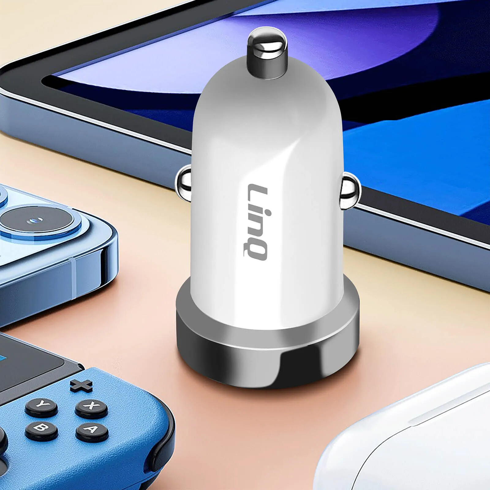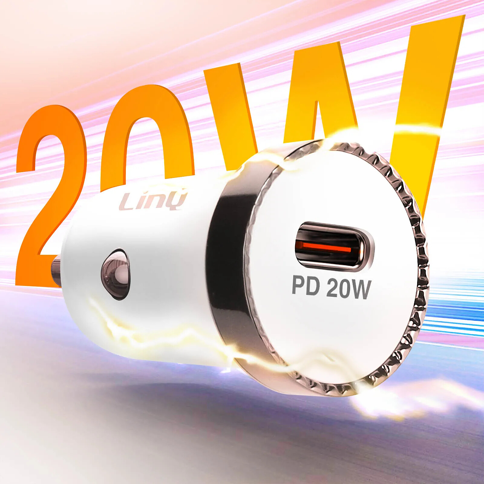 Chargeur voiture avec sortie USB-C, de la marque LinQ. Charge ultra-rapide avec technologie Power Delivery de 20W. Compatibilité universelle avec les appareils se chargeant via un câble USB-C. Protections de charge intégrées. Design compact et élégant.