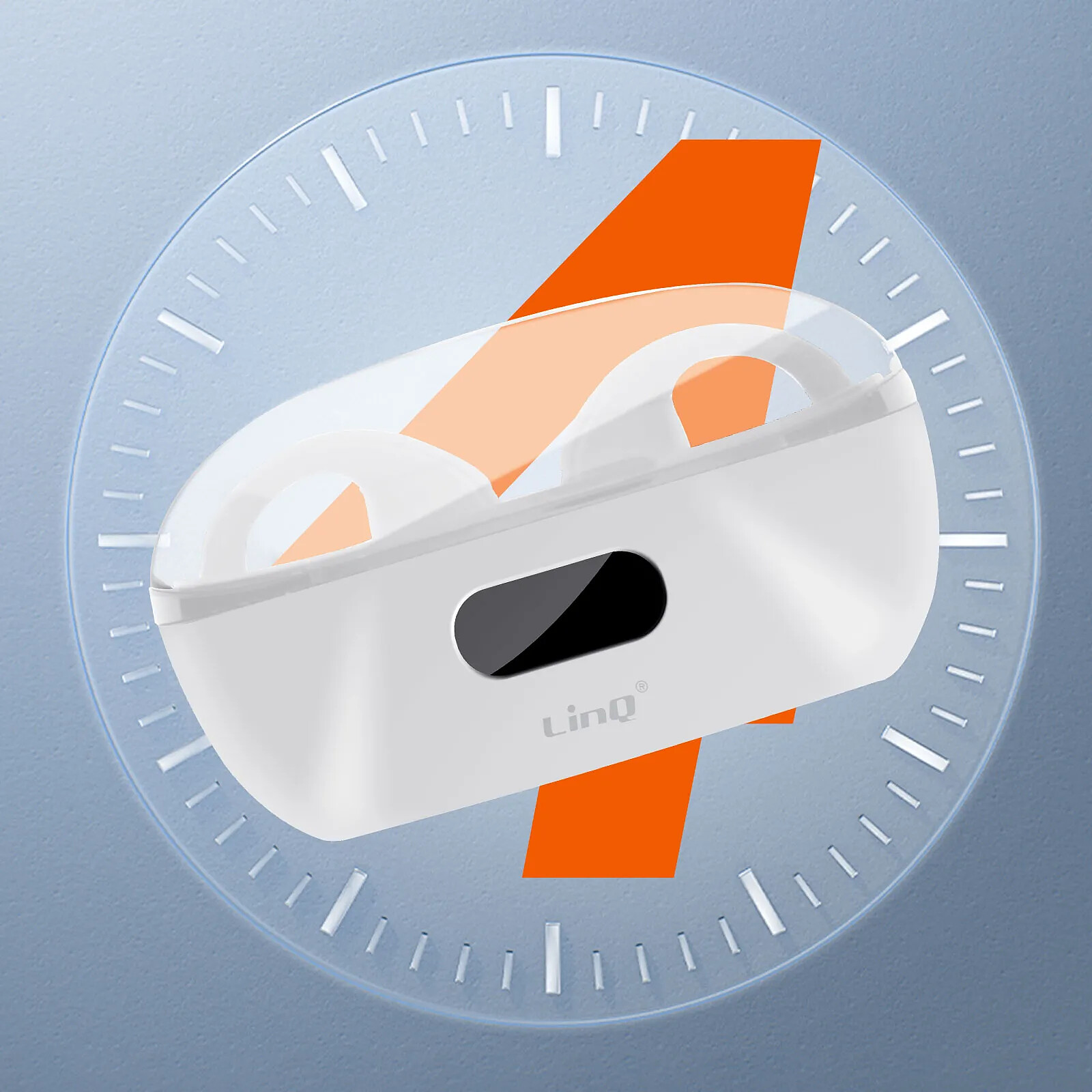 Écouteurs Sans Fil de la marque LinQ. Technologie de conduction aérienne avec design sans fil et clip-on. Conception ergonomique et très confortable. Microphone intégré pour appels et contrôle tactile simple. Connexion Bluetooth 5.0 pour une portée jusqu'à 10m. Autonomie jusqu'à 4h. Boîtier de charge inclus avec affichage LED.
