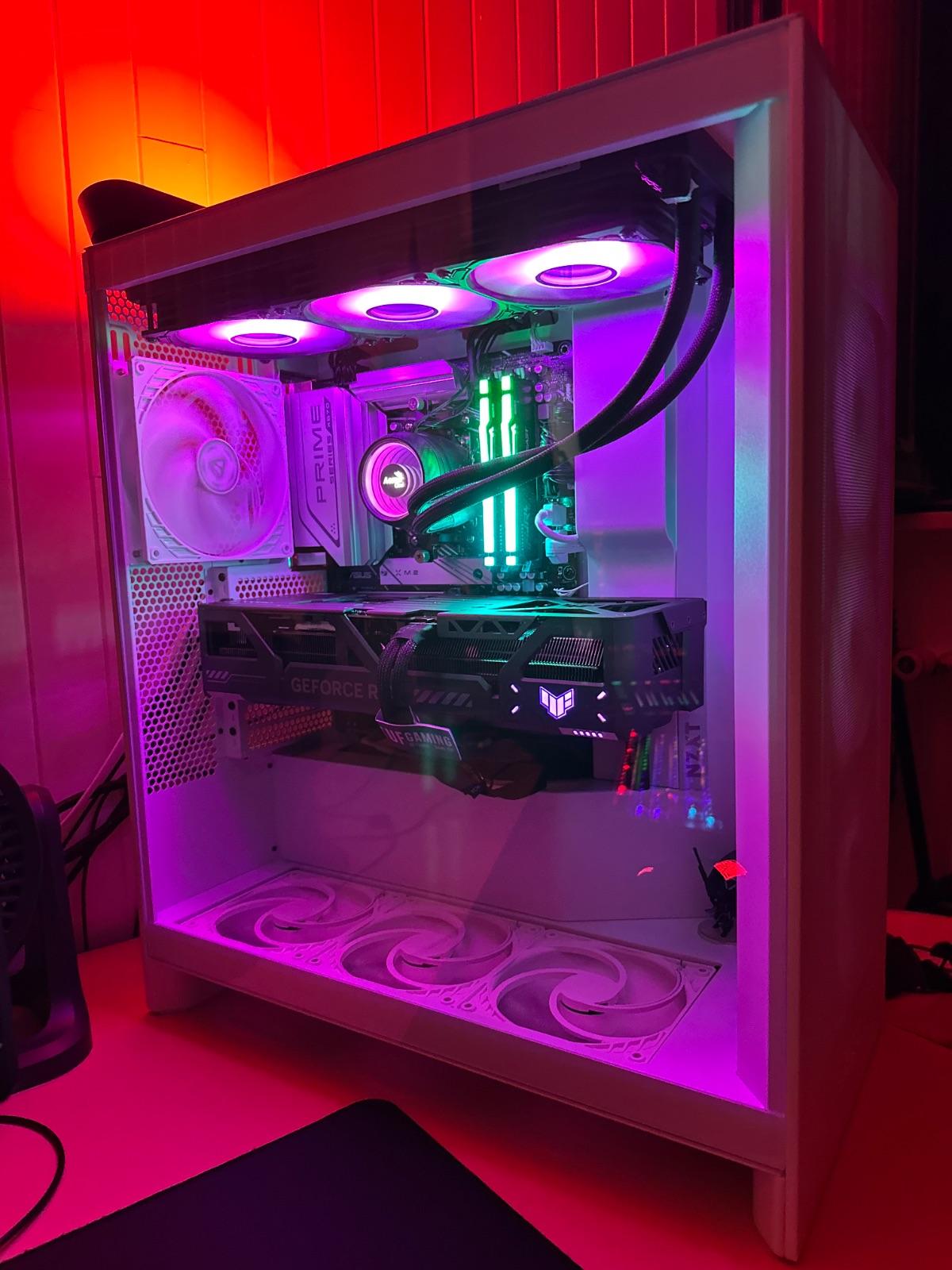 Installée dans un boîtier spacieux (Corsair 5000D), cette TUF RTX 5090 s’intègre parfaitement grâce à son support réglable solide et à son design sobre (RGB minimaliste mais élégant). Ça sent la robustesse et la fiabilité à plein nez.