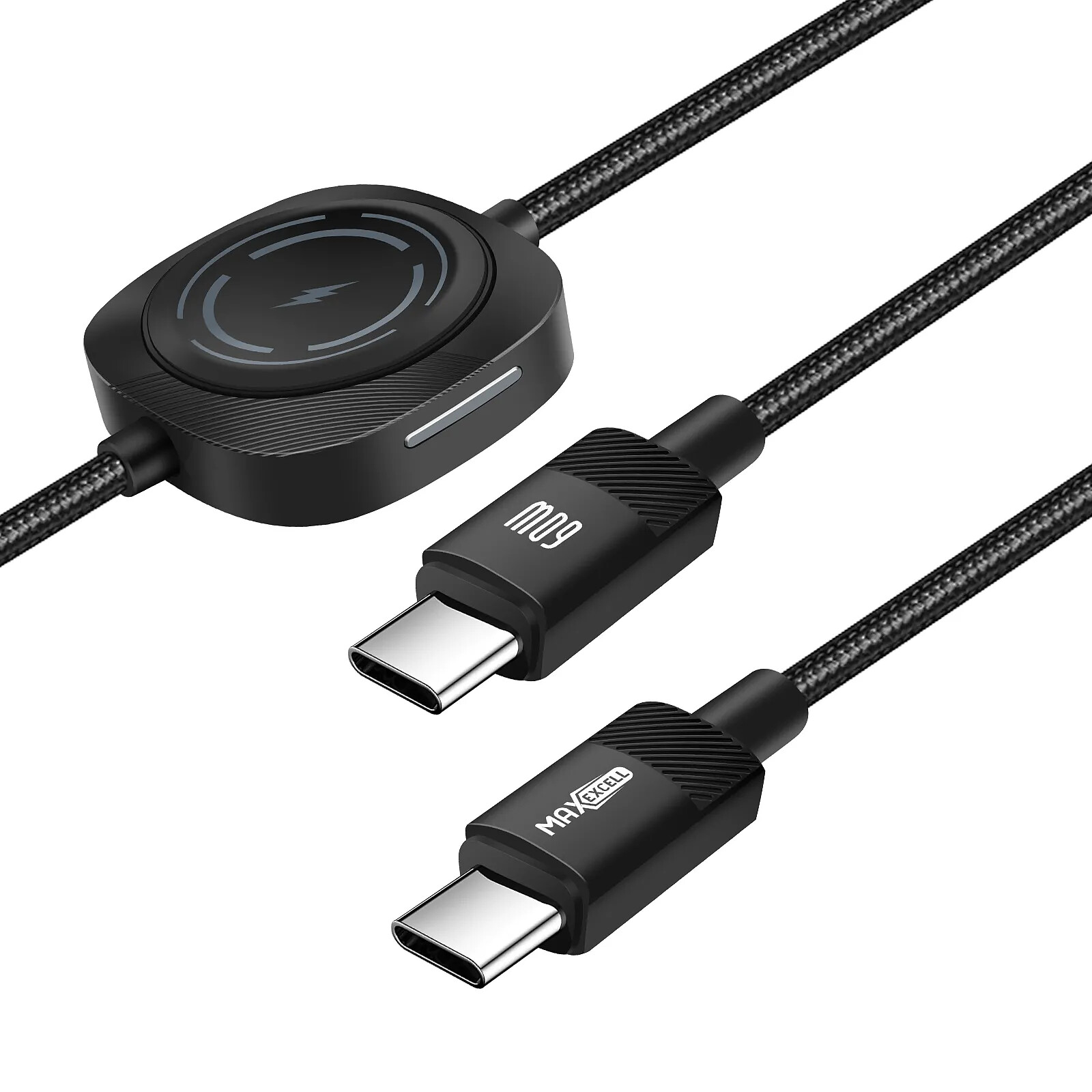 Câble USB-C vers USB-C et Apple Watch de Max Excell. Permet une recharge simultanée d'un appareil USB C et d'un Apple Watch. Supporte une puissance de 60W. Surface magnétique pour une recharge stable de l'Apple Watch. En matériau de qualité + nylon tressé durable. Longueur idéale de un mètre. Design léger et portable.
