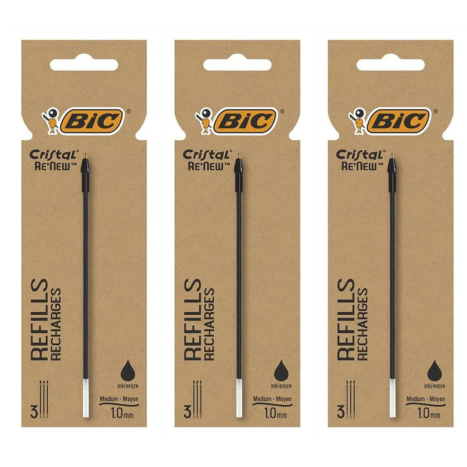 BIC Etui de 3 Recharges pour Stylo Bille Cristal Re’New Pointe Moyenne Noire x 3 |