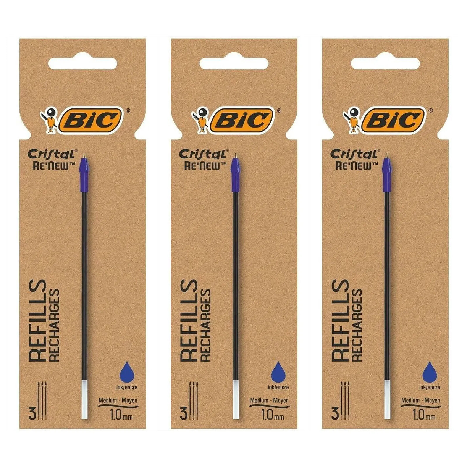 BIC Etui de 3 Recharges pour Stylo Bille Cristal Re’New Pointe Moyenne bleue x 3 |