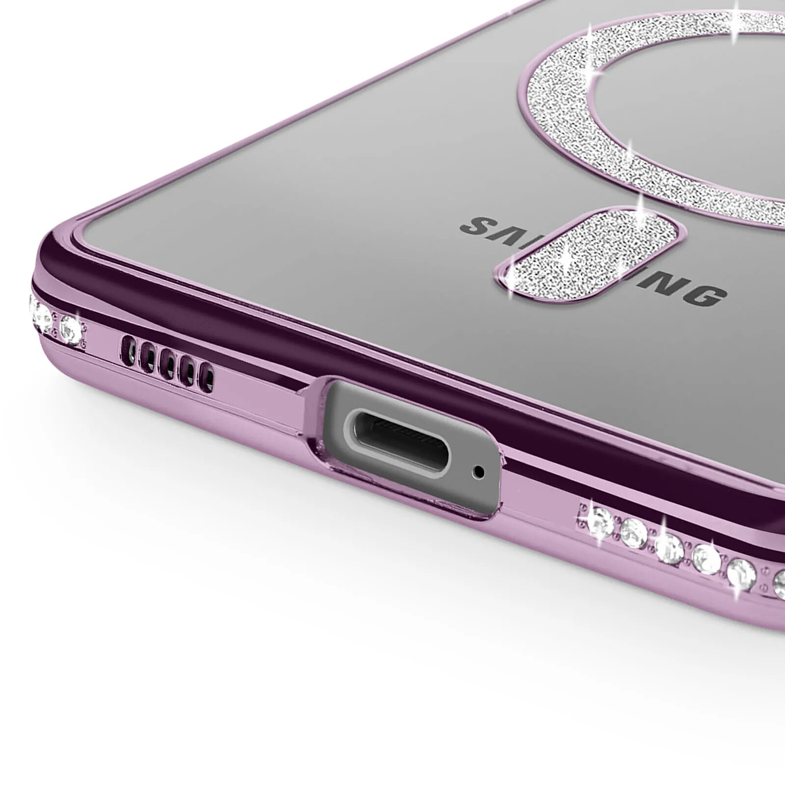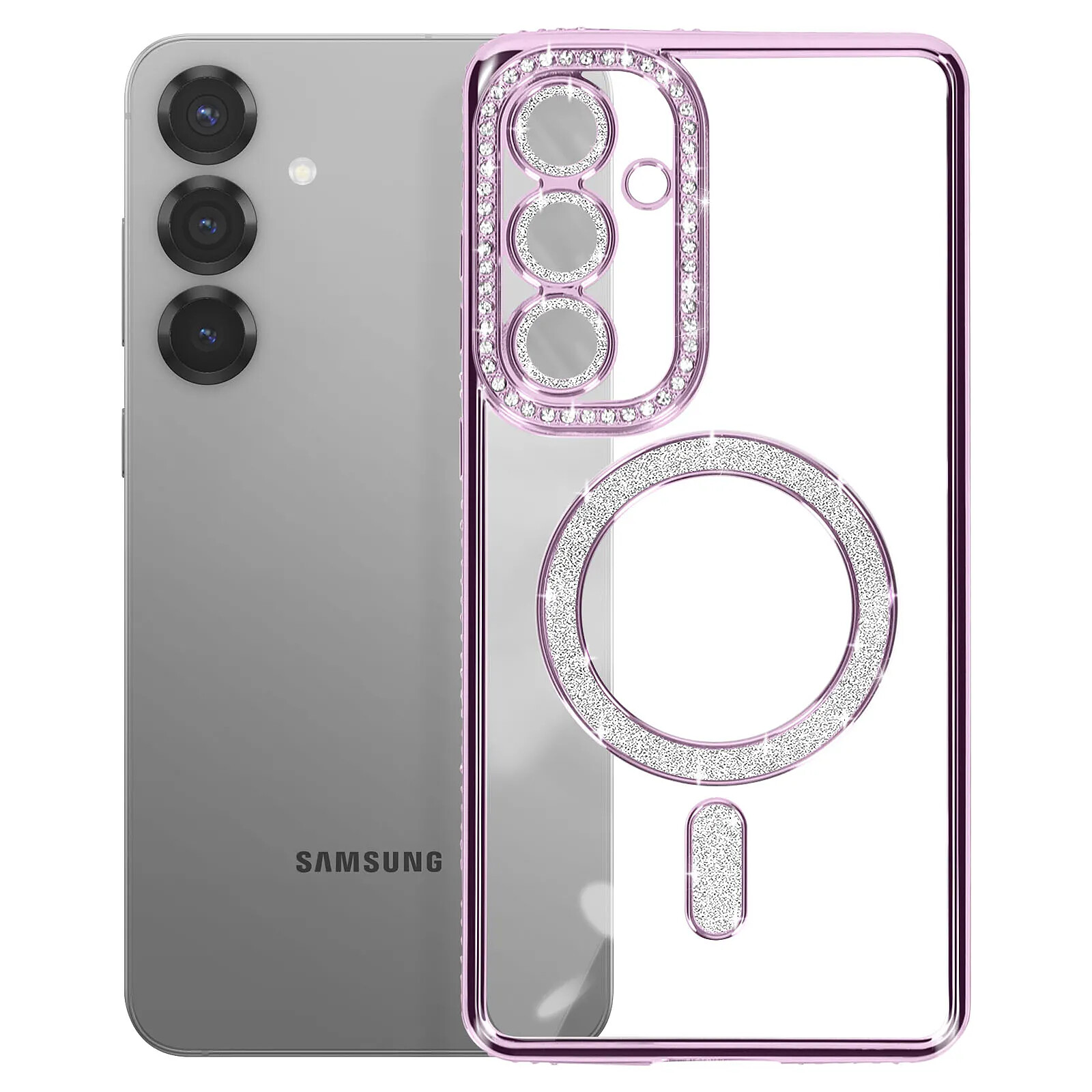 Coque diamant pour Samsung Galaxy S25 au contour strass Violet très élégante et unique. Conception résistante avec bloc caméra protégé. Dos transparent. Cercle magnétique compatible accessoires MagSafe. Fonctions accessibles. Boutons latéraux redessinés.