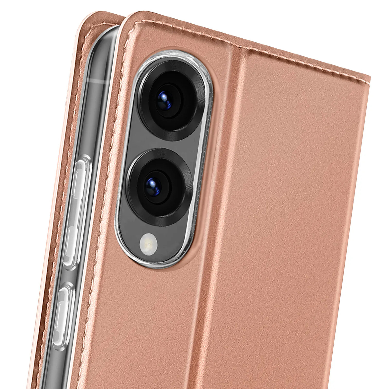 Étui clapet Dux Ducis Rose Gold pour Samsung Galaxy S25 Edge. Un rabat magnétique assure une fermeture rapide et sécurisée. Un support vidéo intégré. Un porte-carte discret. Des découpes précises. Une finition luxueuse.