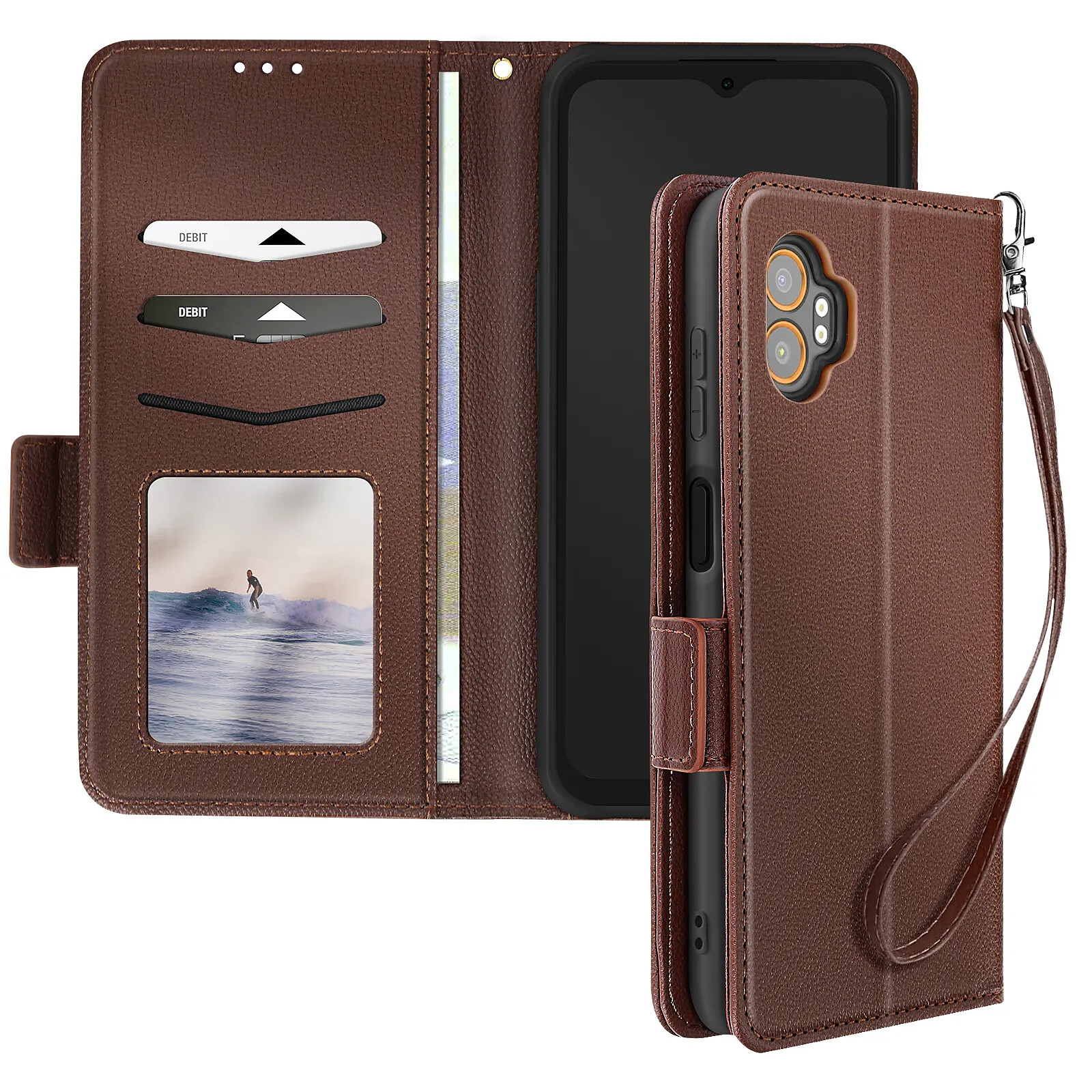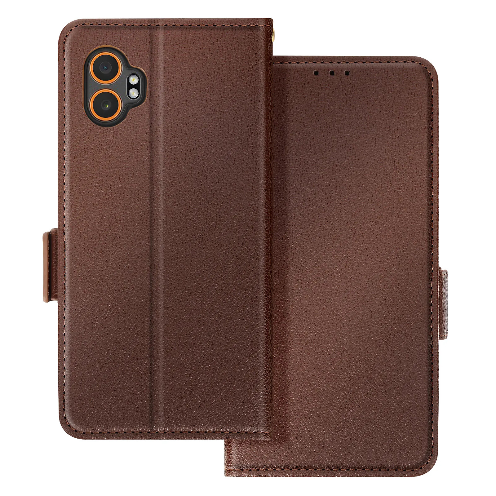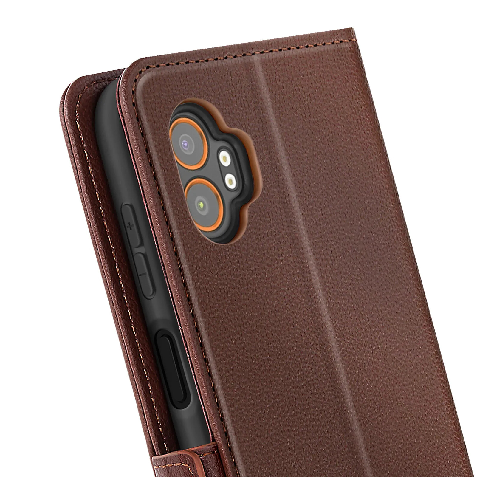 Housse avec dragonne pour Samsung Galaxy XCover 7 Pro. Espaces de rangement pour cartes + pochette latérale pour billets. Fonction support vidéo. Revêtement en simili cuir marron aux finitions surpiquées. Fonctionnalités accessibles et boutons redessinés.