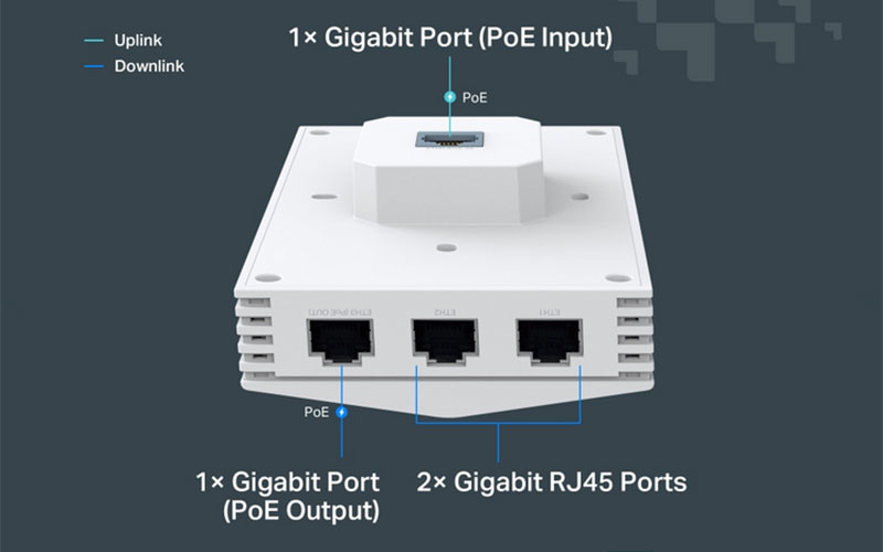 - 1 port Gigabit PoE in (uplink) + 1 port Gigabit PoE out (downlink) + 2 ports Gigabit RJ-45