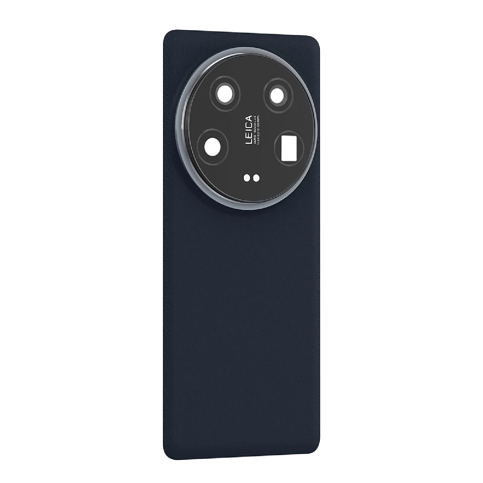 Cache batterie de remplacement compatible avec le smartphone Xiaomi 14 Ultra. Cache arrière noir avec revêtement façon similicuir et large contour circulaire brillant pour les caméras. Partie extérieure texturée, cadre intérieur en plastique rigide injecté. Compatible avec la lentille photo circulaire Leica d'origine. Adhésif de fixation déjà préinstallé pour un montage sécurisé.