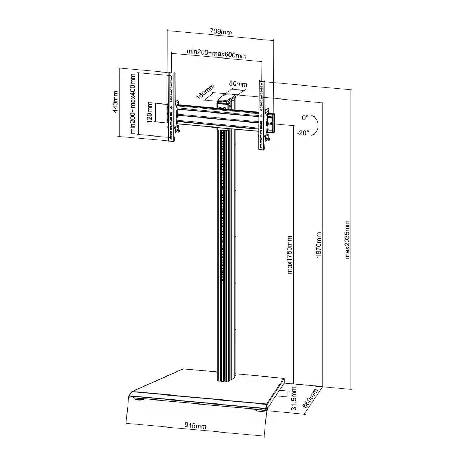 Le support sur pied KIMEX 031-1102K1B est conçu pour accueillir un écran TV de 32 à 75" répondant aux standards VESA (100x100 min, 600x400 max), jusqu'à 50 kg. Ce support professionnel pour écran TV est composé d'une solide base de sol pour une parfaite stabilité et d'un mât robuste sur lequel vous pourrez adapter facilement le niveau de votre écran (jusqu'à 175 cm de hauteur, centre de l'écran). Les barres de fixation VESA proposées avec ce support disposent d'un système d'inclinaison efficace à cran (0°/ -5° / -10°/ -15° et -20°) qui vous permet d'ajuster avec précision la position et l'orientation de votre écran. Fonctionnel et polyvalent, le support sur pied KIMEX 031-1102K1B dispose enfin de solides passe-câbles sur la partie arrière du pied, il se caractérise ainsi par un design moderne et élégant qui en fait une solution idéale pour une utilisation active en milieu professionnel, pour des bureaux, sur des salons, dans des centres commerciaux, des vitrines... Avantages :Ecran ajustable en hauteur le long du mât et inclinable jusqu'à -20° pour le meilleur angle de visualisationDispose d'une solide base à poser au sol qui lui assure une stabilité maximaleSystème antivol pour une parfaite sécurité (cadenas optionnel)Passage des câbles sur la partie arrière pour le meilleur rendu esthétique.