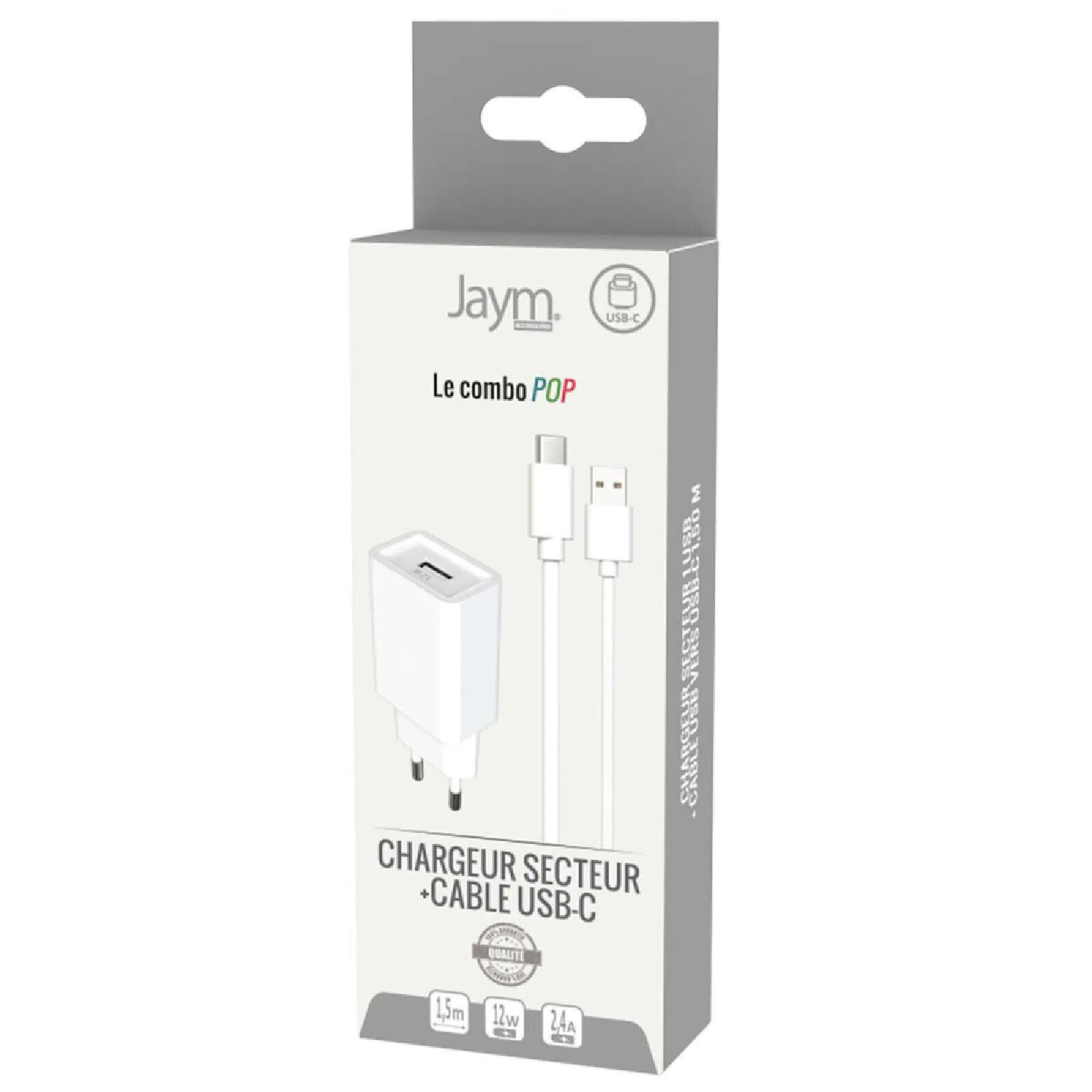 Jaym Pack de Charge Chargeur Secteur USB-A 2.4A avec Câble USB-A vers USB-C 1.5m Blanc