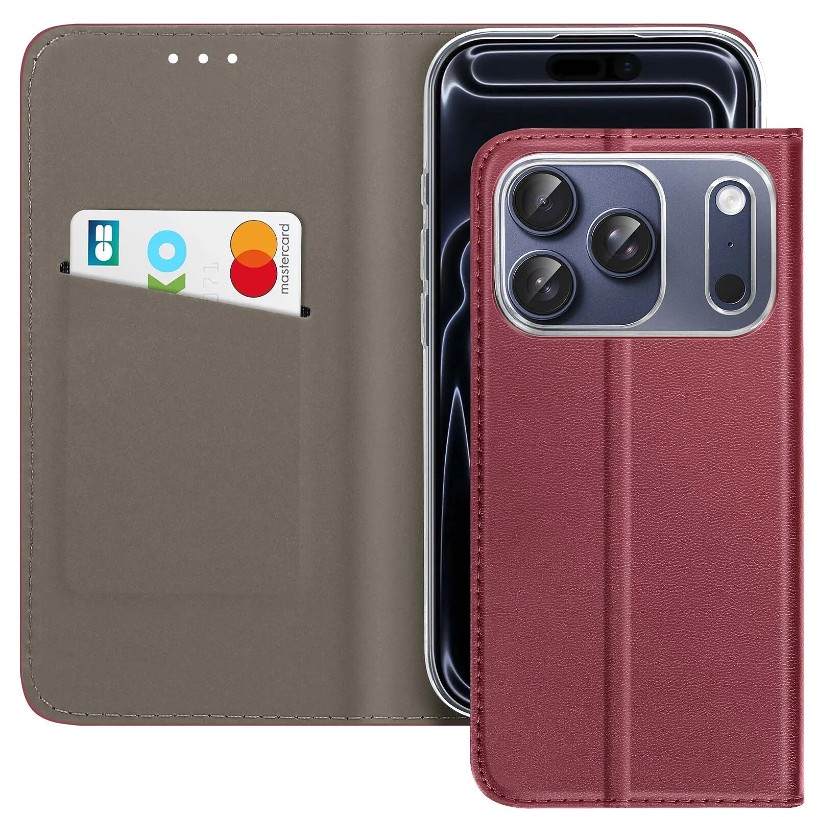 Offrez à votre iPhone 17 Pro Max une protection élégante avec cet étui similicuir bordeaux. Son design raffiné intègre un emplacement discret pour carte bancaire et un rabat aimanté puissant pour sécuriser l'écran. La coque intérieure en silicone absorbe les chocs et rayures, tandis que le rabat pliable sert de support vidéo pratique. Ses découpes précises permet un accès fluide aux boutons, connecteurs et caméras.