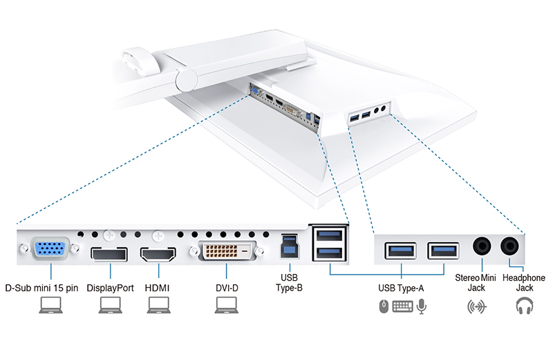 L'écran EIZO EV2410R ne se contente pas d’un rendu visuel soigné : il propose aussi une connectivité complète avec quatre entrées (DisplayPort, HDMI, DVI-D et D-Sub) assurant la compatibilité avec des systèmes modernes comme anciens. Un hub USB 3.0 est intégré (1 port upstream, 4 ports downstream) pour alimenter ou connecter vos périphériques directement via le moniteur. Côté ergonomie, le pied réglable en hauteur sur 130 mm, inclinaison, pivotement et rotation sur 90°, idéal pour trouver la position de travail la plus confortable.