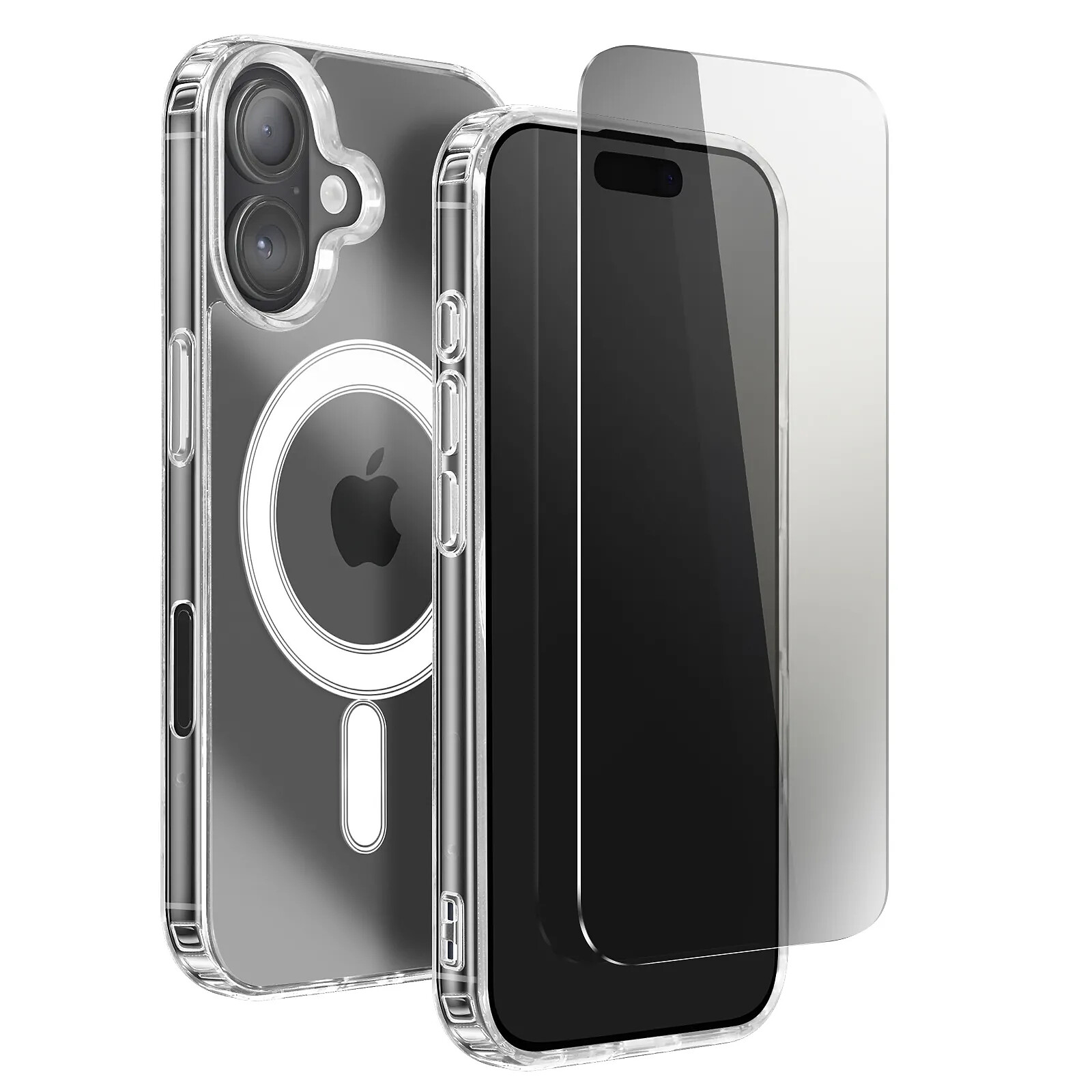 Coque MagSafe rigide avec coins renforcés et absorption antichoc pour une sécurité maximale Compatible avec tous les accessoires MagSafe pour recharge rapide et fixation fiable Verre trempé haute résistance avec applicateur pour une pose sans bulles ni traces Tactilité parfaite et restitution fidèle des couleurs grâce au verre ultra clair