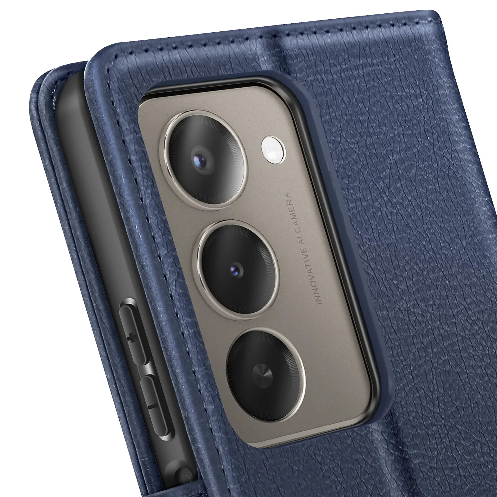 Cet étui portefeuille bleu nuit pour Xiaomi Redmi 15 5G présente une finition Chesterfield à surface grainée. Deux fentes verticales dans le rabat maintiennent cartes bancaires et badges, tandis qu'un compartiment latéral glisse des billets ou reçus à plat. La coque rigide en polycarbonate bloque fermement le smartphone et protège le module photo. Le rabat pliable forme un support stable pour vidéos et appels visio.