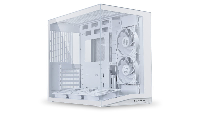 La conception unique et le format moyen tour original du O11D Mini V2 Flow lui octroient la possibilité d'être équipé de 9 ventilateurs au maximum : 2 x 120 mm ou 2 x 140 mm sur le côté près de la façade, 3 x 120 ou 2 x 140 mm sur le dessus et en dessous, ainsi que 1 x 120 mm à l'arrière. Dans sa configuration Flow, il est ici équipé de 2 ventilateurs latéraux de 120 mm pales inversés et de 3 ventilateurs de 120 mm pales inversés en position basse.