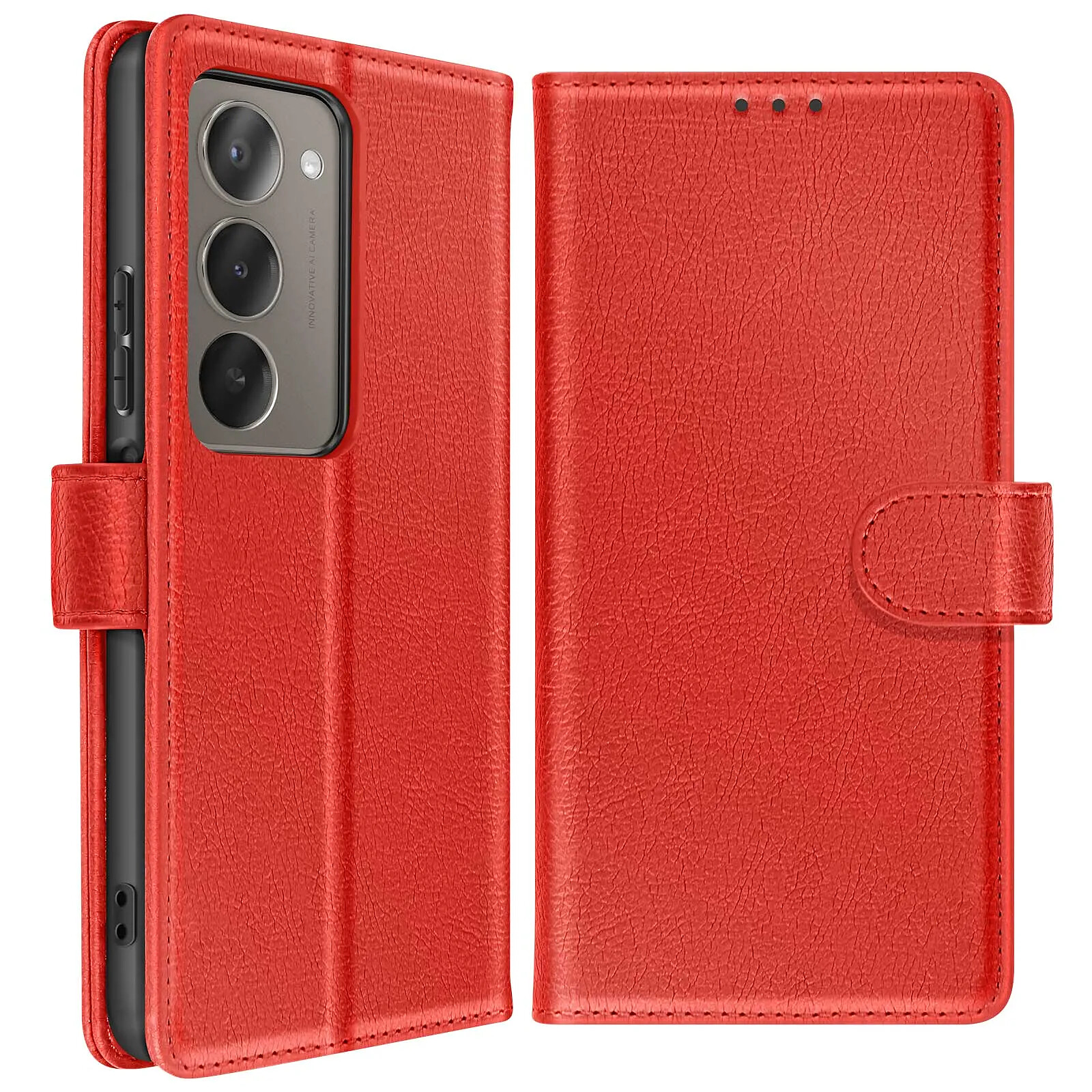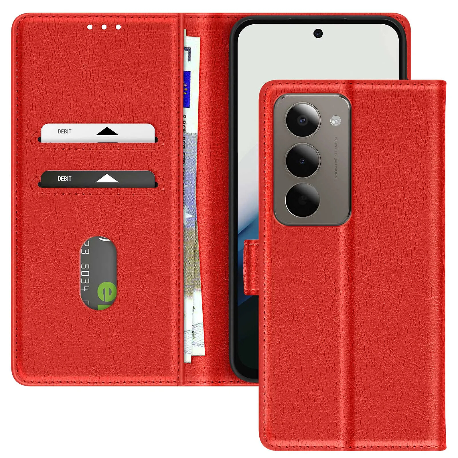 Cet étui portefeuille rouge pour Xiaomi Redmi 15 5G présente une finition Chesterfield à surface grainée. Deux fentes verticales dans le rabat maintiennent cartes bancaires et badges, tandis qu'un compartiment latéral glisse des billets ou reçus à plat. La coque rigide en polycarbonate bloque fermement le smartphone et protège le module photo. Le rabat pliable forme un support stable pour vidéos et appels visio.