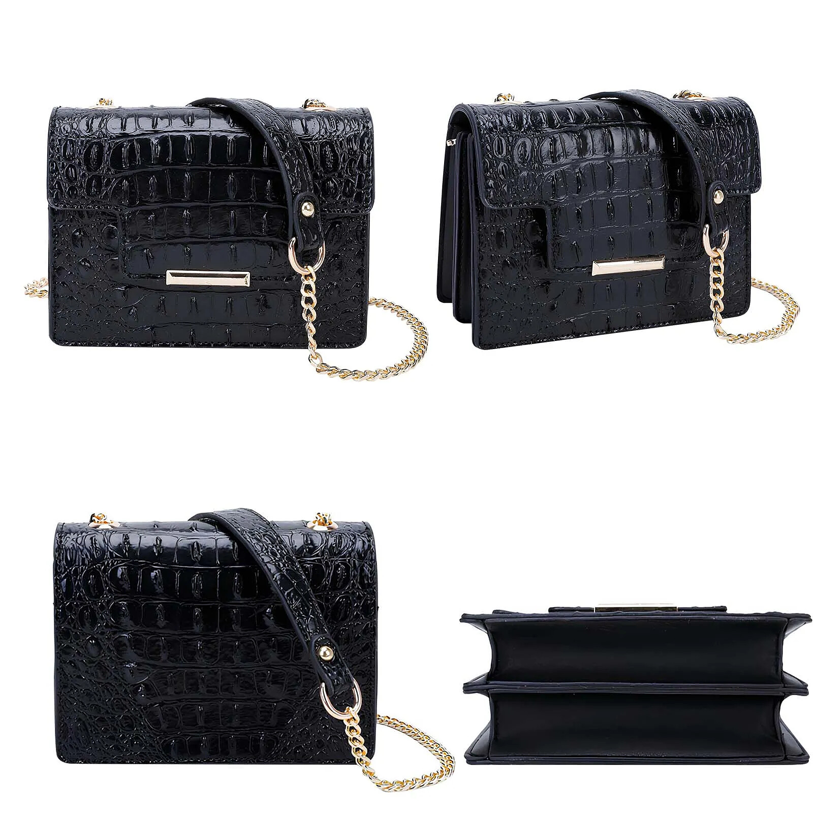 Ce sac bandoulière noir effet croco vernis présente une taille compacte adaptée aux sorties